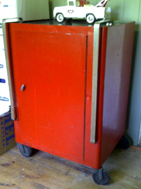 This actually looks like an old Sun Equipment cabinet that's been repainted over the original bluish grey hammertone finish. Can see this very easily having a distribuor machine or a smaller Sun Ignition Analyzer mounted to the top of it. They were well built, heavy duty cabinets.
