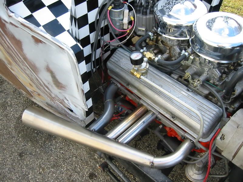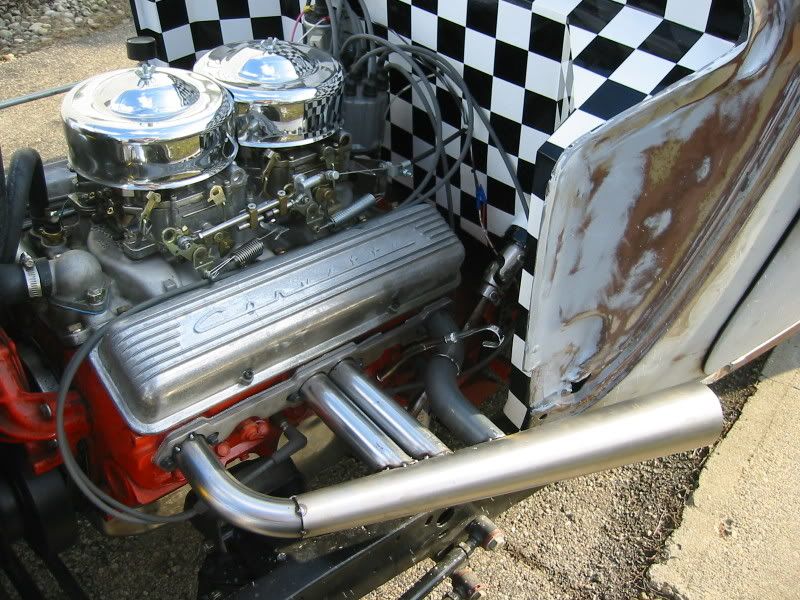 This is the original set of mid-40's headers off my 28 dry lakes roadster that go to the 4-banger. These tuck under the car and not out the side. You can see the byp*** that would take the exhaust to the back of the roadster when driven on the street. Otherwise they'd be uncorked and used at the lakes.