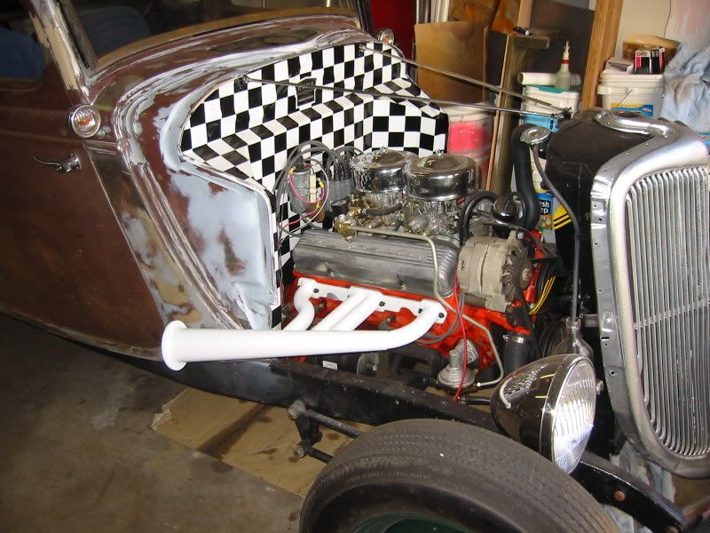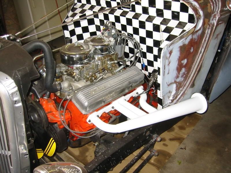 I had to get mildly creative due to the fact that my engine set-back was several inches more than it should have been and I didn't want to cut into the firewall for header clearance. Below is a Speedway kit that I worked over. Here they are prior to paint, turn-out flange and final welding. Here they are the night I painted them. Sadly, the Duplicolor Heat paint I used lasted a mere 20 minutes. I have since learned how to paint headers the right way and these will soon be done the right way. Vance