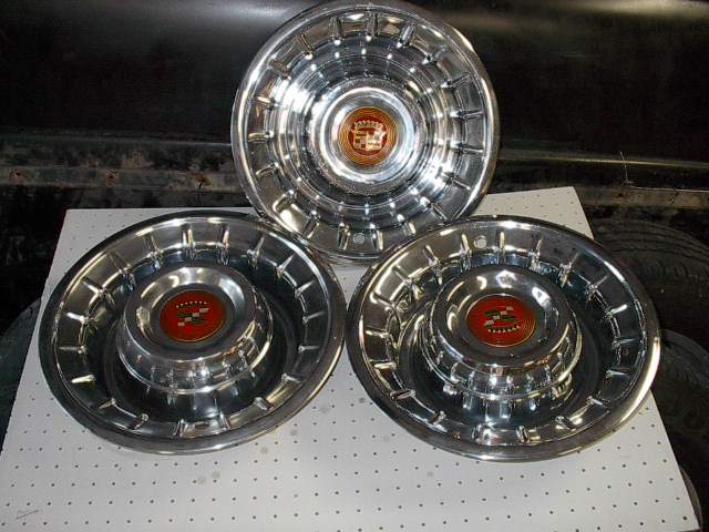 I have these three Cadillac hubcaps. I don't know the year, or model they came from, do you? I thought '55, then was told '58...I looked on the net for pictures, but have not seen any years from 48-60 that show THESE wheelcovers. HELP! They are all almost NOS, two have the same center cap, one doesn't (slightly different), they were found on a basement shelf in Detroit. Almost NO WEAR. Don't know much about them except they are fine, fine, fine...looking to sell 'em, too.