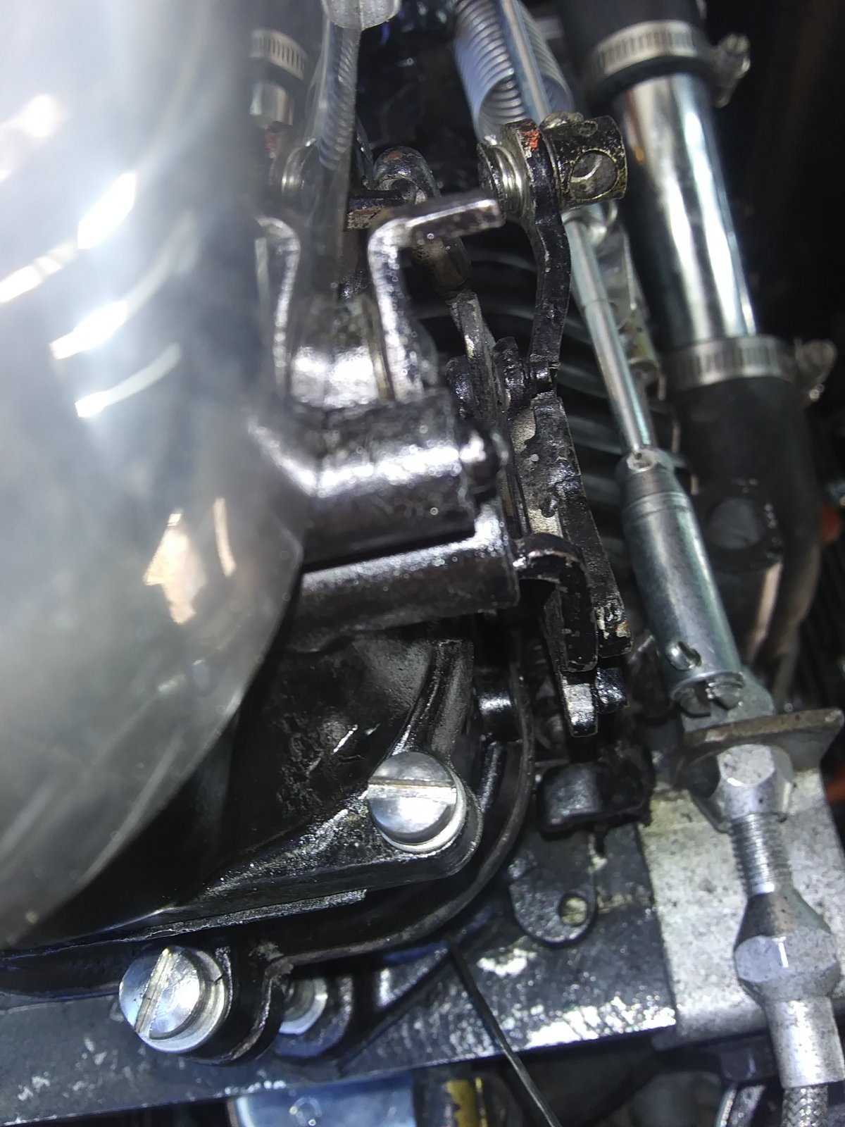 OK, really that stupid a question? I asked because mine has no spring. I'm now home for a closer look. First off, the linkage is obviously different looking at it from the side. I see where the one tab in front would take a spring but not the other side. Also, the two pieces that would move by the spring are welded together (hard to see in the photo). Mine is an original (not reproduction) that has been on a hot rod for many years, good chance somebody modified it, why I don't know, seems to work fine. I would like to know what the spring mechanism does, beside opening and closing the choke, I got that now.