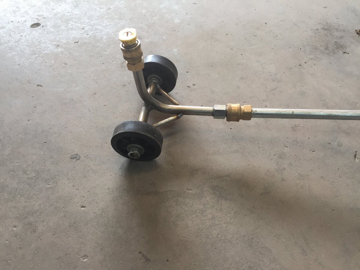 Here is something I built in the past but I modified last week. It is an attachment for my pressure washer that enables the operator to stand beside the vehicle and wash the underside. It solves two problems for me, having a clean vehicle to work on, and standing instead of bending over or laying down. It originally had a skid plate but last week I added the wheels. This is an important feature as it keeps the device from turning sideways from the intended direction. Trying to hold on to a pressure washer wand that is turned at 90 degrees is like something from a 3 Stooges film.
