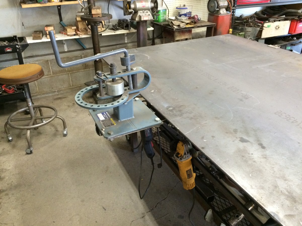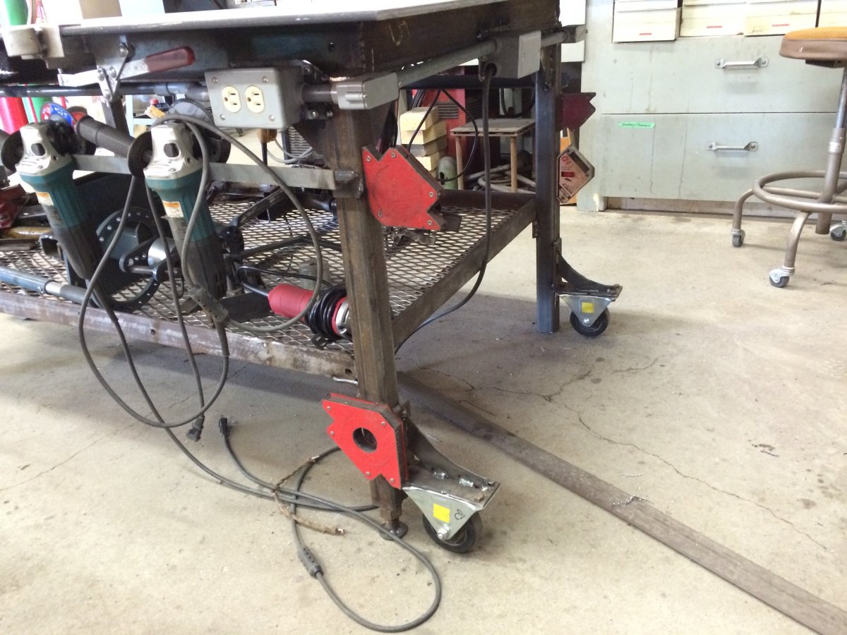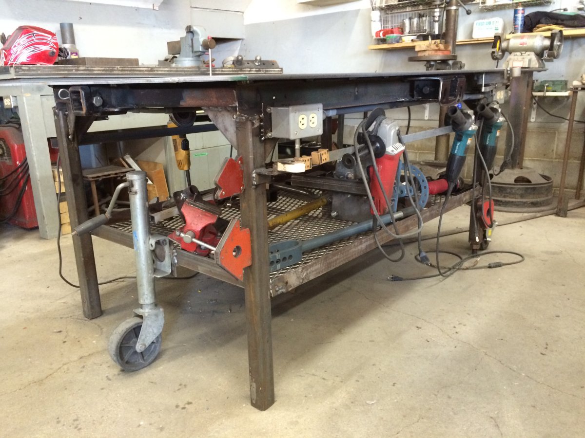 Here is the welding table I built (more for the wife for her metal sculpture but I get to use it too:) Itis 4x6, 3/8 plate and has casters on the back and a tongue jack if I want to move it. Outlets on all corners, two inch receivers on the sides for different tooling, angle to hold the grinders/etc under the table, perforated shelf under it for seldom used tools plus the dirt falls through:) and a home made "stinger" holder that can be moved around. Other than the top and shelf it was made from scrap we had laying around. It is used every day that we are in the shop. IMG_1362.JPG IMG_1363.JPG IMG_1365.JPG IMG_1366.JPG IMG_1368.JPG