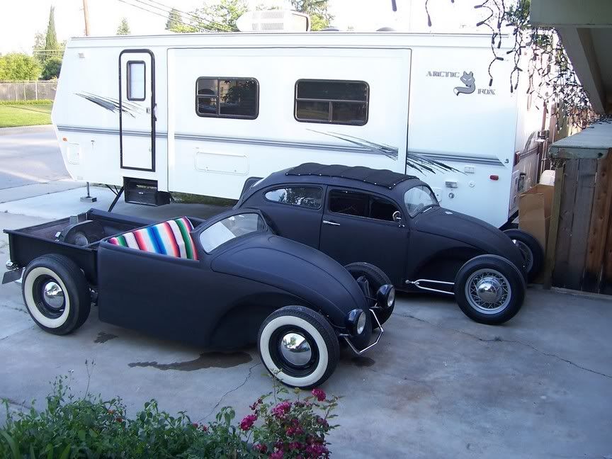 Hey everyone, I have been registered for a while now, but have just been lurking (for too long!) Thought that it was time to introduce myself. My name is Rob and I live in Campbell Ca along with my wife and two kids. I have been a car guy as long as I can remember. Here is a picture that has a 1930 Tudor sedan that I built with my (then soon to be) father in law. (Click on the pics) I am also starting to mess with a pinstriping brush and some 1-shot! My current ride started life as a sedan and has been turned into a roadster pickup! It has been chopped about 8", channeled 4", doors welded shut, shortened Model A pickup bed, fenderless, white wall bias ply's and has been painted House Of Kolor Black primer/sealer! I am providing you with a link to a picture of it, but I am letting you know now that the sedan that it was started with was a 1964 VW bug, so click at your own risk! http://img.photobucket.com/albums/v...edo Final Day/5-23-05VolkstruckAllDone002.jpg
