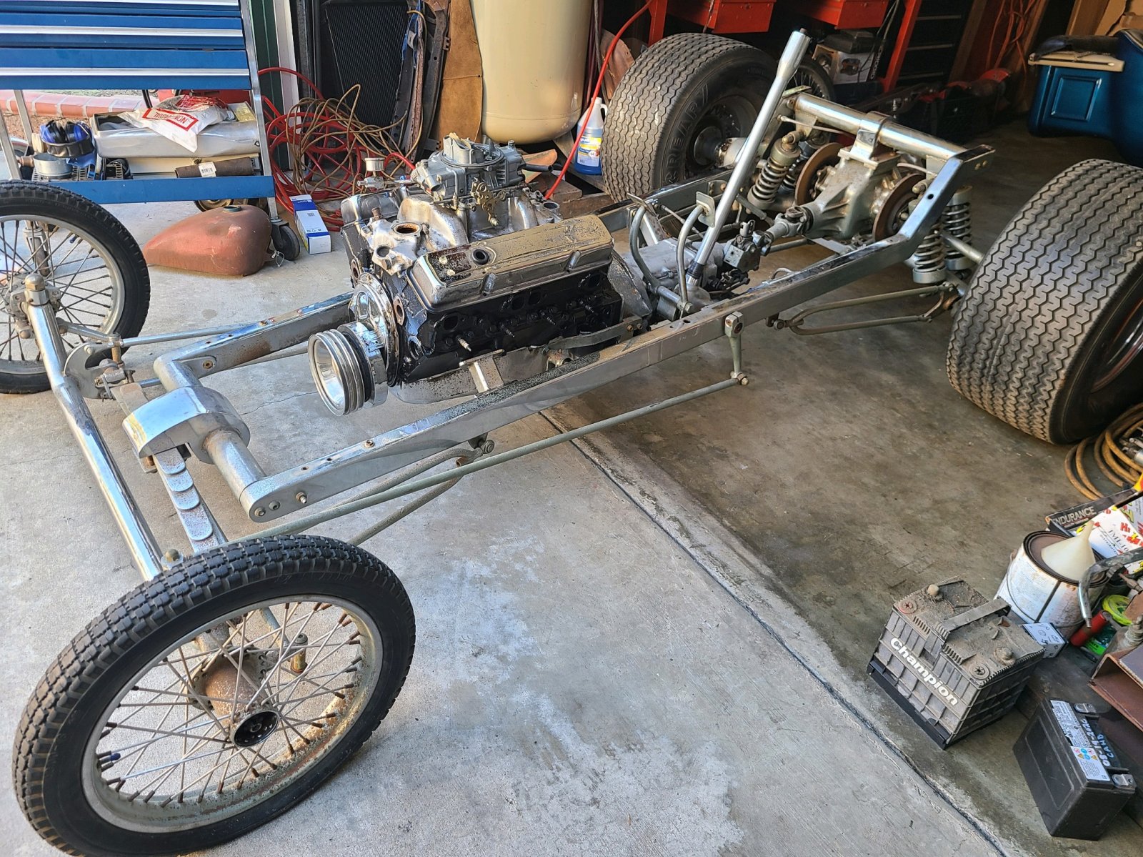 Seller says it was first titled in 1969 and has all the hallmarks of a show rod. Fully chromed chassis with all three cross members bolted in, F1 steering, SBC with 4 speed and Jaguar IRS, most also chromed. It got updated some in the 90s, so not all the OE stuff survived. Missing stuff includes a blower and the windshield, and the rear wheels and valve covers are modern era that I can spot easily. I didn't ask about paint, but I doubt it was a solid Blue back in the days of Himsl and others. he sent a couple pics of the bare chassis when the engine was swapped. The blower required holes in the ends of the heads and small hoses to radiator, that was also changed later, but the plugs can be seen in the first picture.