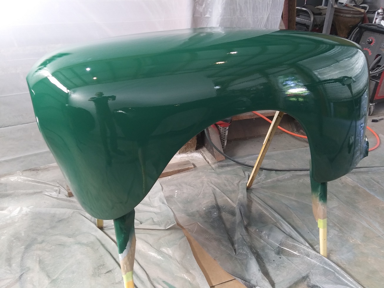 Finally sprayed some color on the first batch of parts after weeks of prep. I'm a novice when it comes to spraying and I'm still learning the lines between orange peel, nice flat finish, and runs, so of course I got all 3. It is single stage paint and I'll be color sanding anyway since I don't have a sanitary area to spray so it should turn out OK. I made a lot of work for myself when I decided to use the english wheel to remove the trim line step that ran the length of the fenders. Flattening that out step pushed metal everywhere and the fenders are surrounded by flanges so the shape changed a lot. Getting the new shape to blend, especially at the ends, was a challenge. If I was to do it again, I'd probably cut the step out and weld in a new piece. Seemed like more work up front, but in the long run I think it would have been less. Either way, I like the look a lot better without the step. I'm happy with how the light frenching panel integrated into the front of the fender.