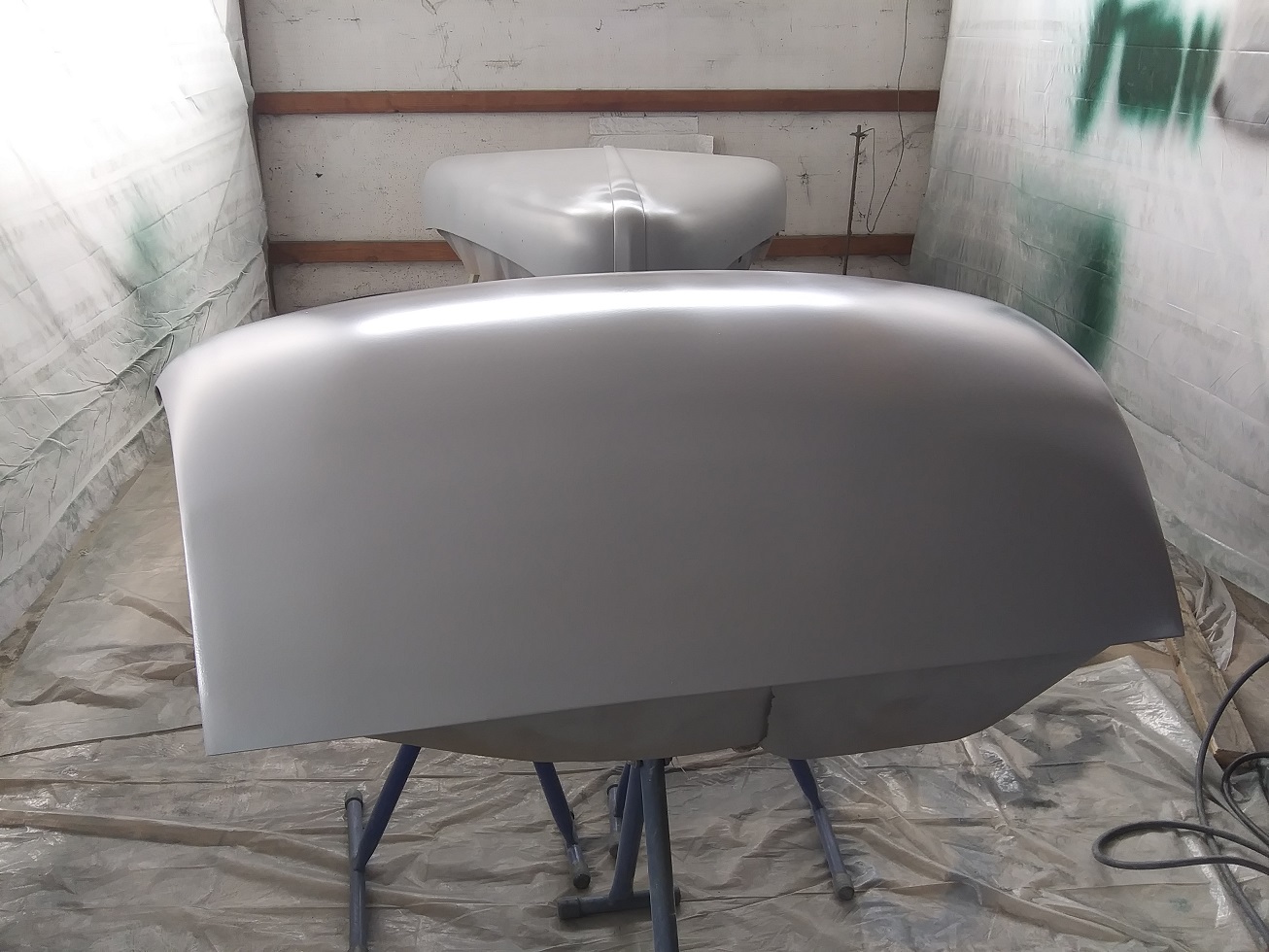 Hood and trunk lid finished. I used a larger gun for the urethane primer which helped it lay out flatter before sanding and I used 10% reducer with the paint along with some technique upgrades. Some improvement from the first batch with room for much more.