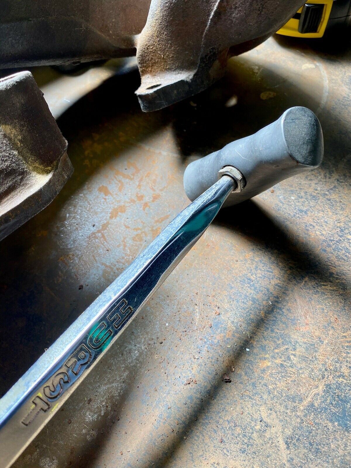 Looks like a bolt on stick made with height and offset. Speedway sells 'em for around $200 I think the smaller letters are a later stick. T handles were made of Aluminum alloy, in HS shop I tapped one to try as a pistol grip. All was cool until I heated it to try melting lead into the original hole. It wrinkled and slumped like a flaccid weenie. Instructor said good Al would have had a much higher melting point. hand dirt and corrosion make 'em look like that. A magnesium one popped up once, bet it weighs next to zilch!