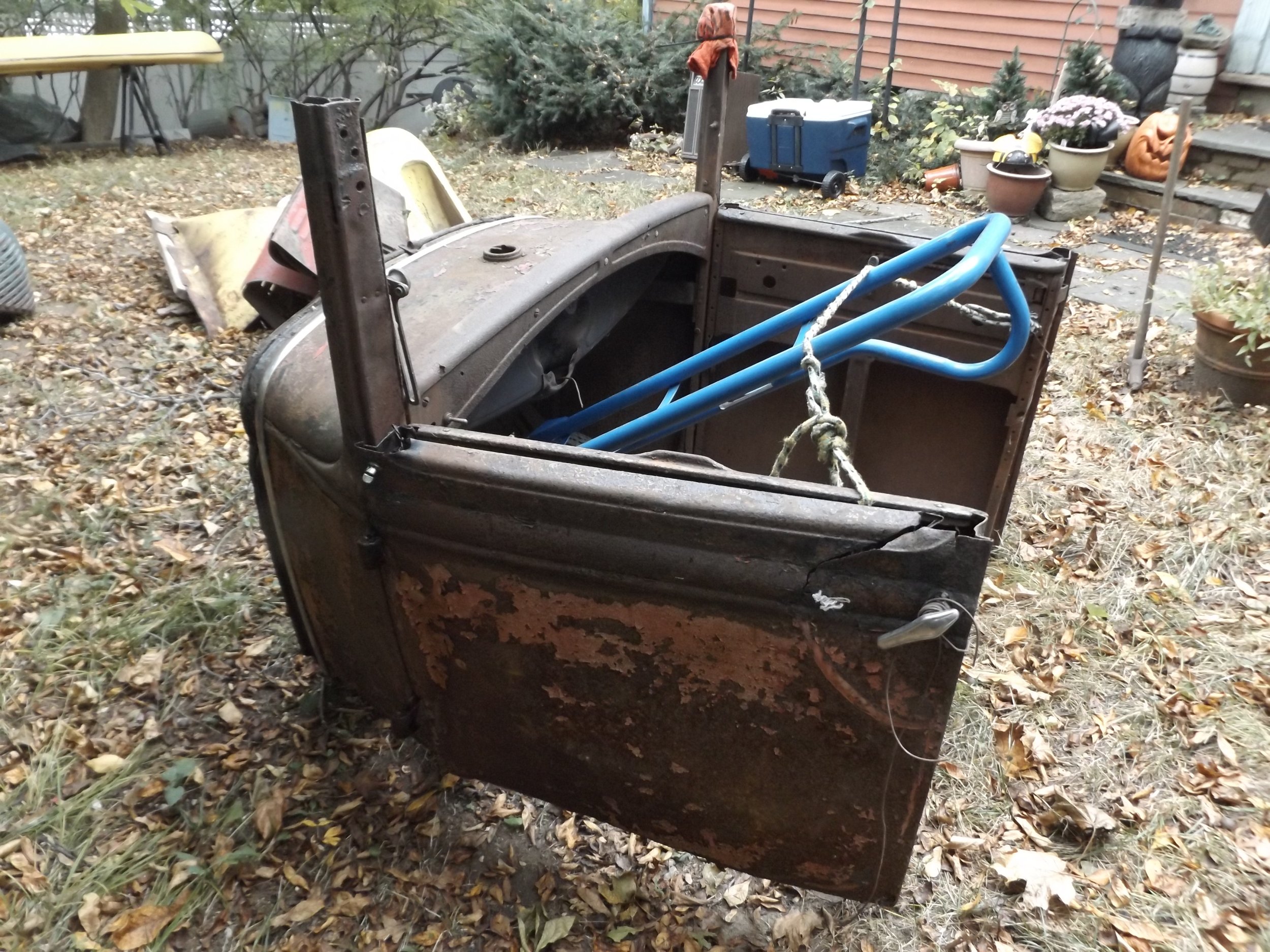 Found this at Hershey, the remains of a 1930 Ford Tudor that ended its life as a dune buggy on Cape Cod. I'll need the top header and door tops along with both top hinges.