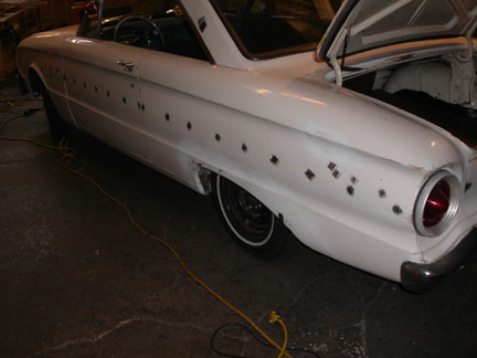 With about 5 hours put into the car last night, Lonestar38 and I got most all the holes filled (nearly 100). The trim holes were larger than Lonestar38 thought they were going to be and that caused a lot of grief. Didn't get to filling any of the large patch areas like the antenna hole, gas cap filler hole, etc. We also discovered the front right fender is bondo heavy. They did a hell of a job, but since the fenders aren't that hard to get, I'm going to try and find a replacement. Anyone know of a 63 passenger fender, e-mail me? We didn't even touch any glaze; just ran out of time. I got my first time on a MIG and they tell me I didn't do too bad. Now I'll have to break down and buy one. Lonestar38's crew in Costa Mesa turned out to be a really nice bunch of guys. I showed up with a case and within hours we had like 7 people there. Old cars were everywhere. Thanks Asher for letting us use the space. Hopefully after my daughter is born this coming Tuesday I can swing by again to say high. Maybe even rope you into some work...