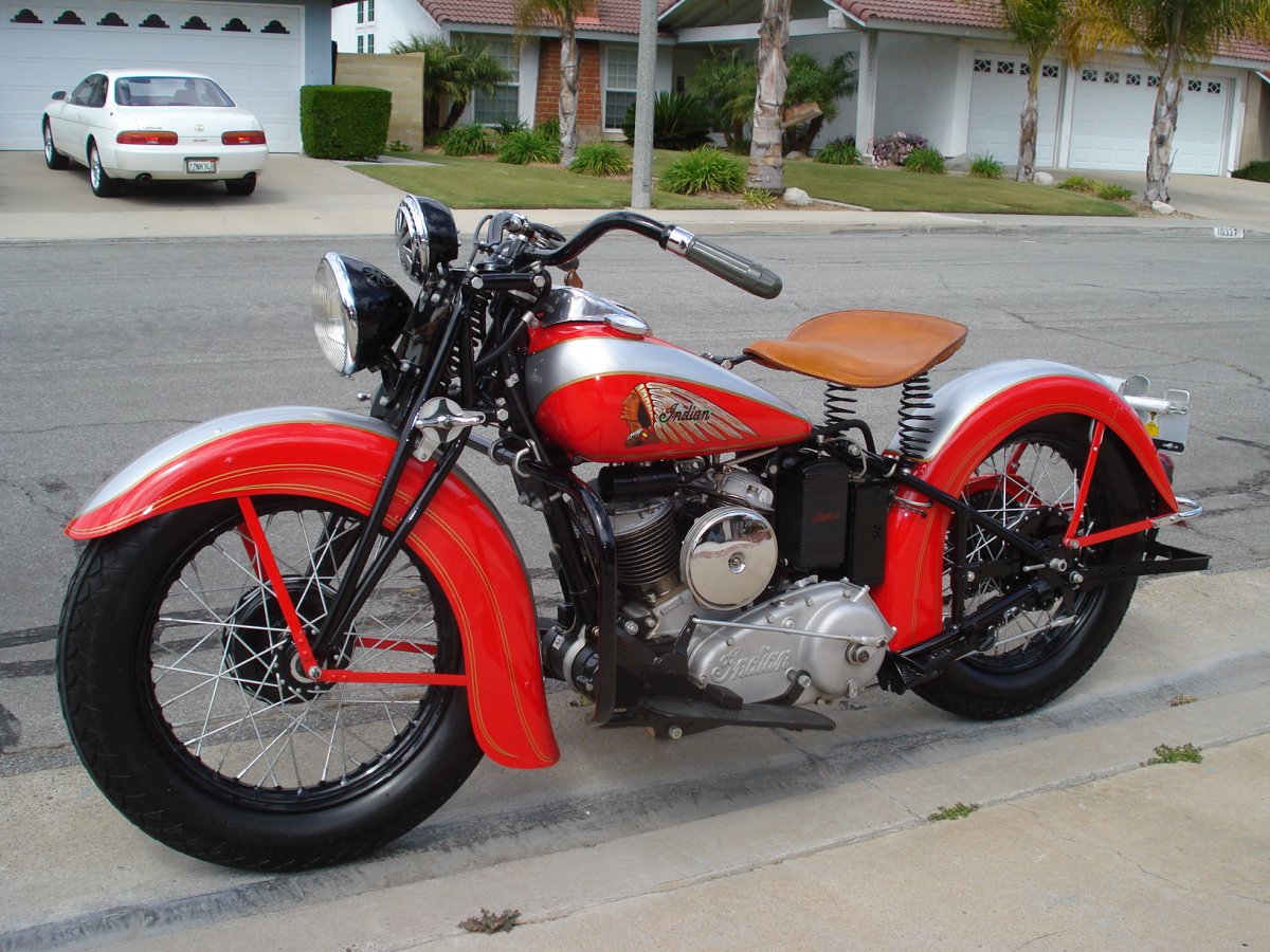 My father bought this 1939 India Sport Scout in 1943 when my mother was carrying me. He road it back and forth to work during the war and for a few years after. He passed away in 1963 and I kept it without my mothers permission as I moved from place to place. In 1996 restoration was started by John Bivens of Indian Restorations in Stanton Ca. It was completed in 2000 and shown for a few years at AMCA meets and Del Mar. I ride it every month or so here in So Cal and ride it to the Donut Derolicks on Saturdays if I get up late and don't take my 56' Victoria. Since we've had it 73 years I don't think it will ever leave the family.