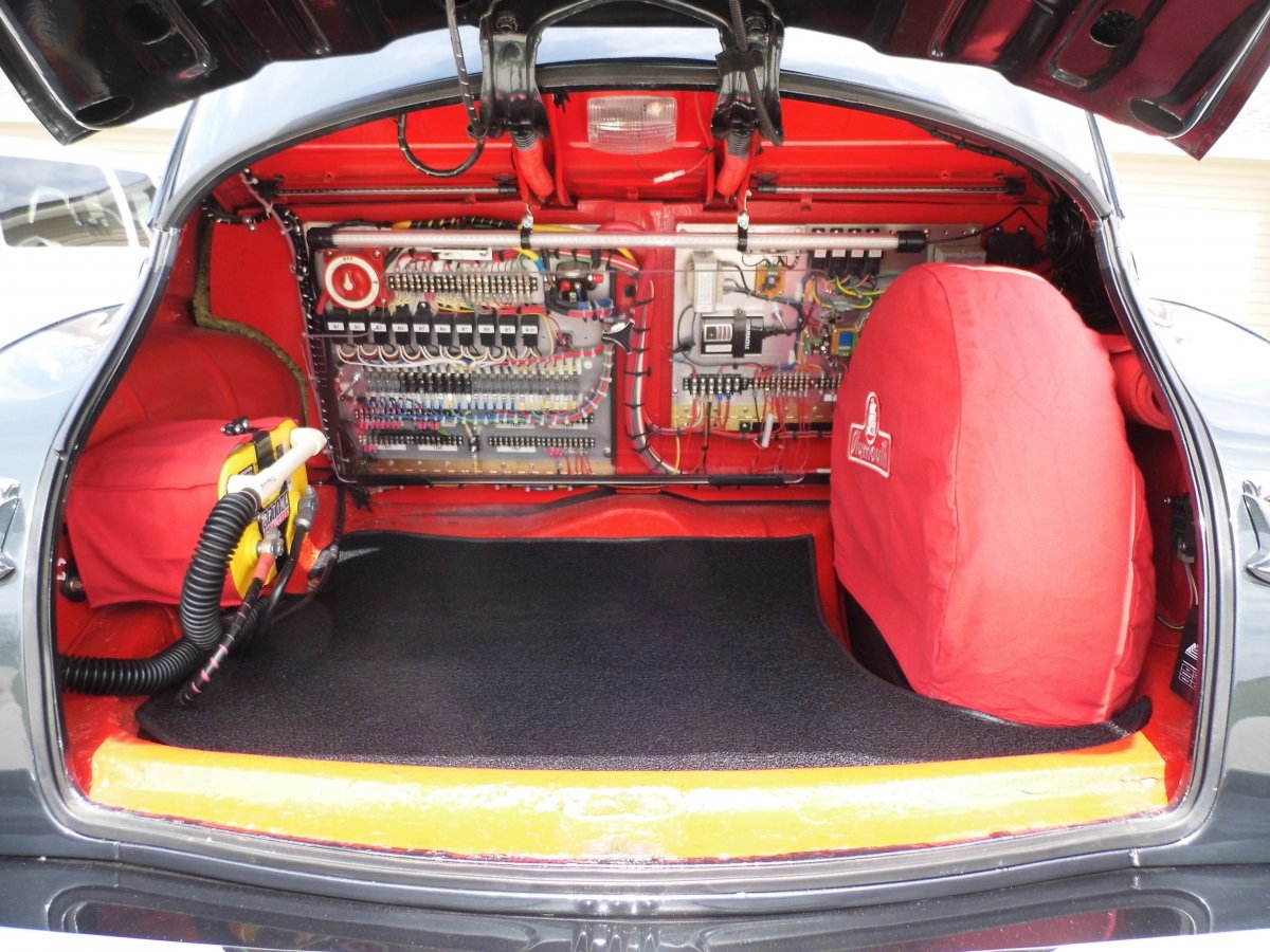 HRP, no upholstery, battery, fuel cell and tow bar mounted on a 2" ball for ballast and emergency. All illuminated by a '34 Ford cowl light converted to 12V