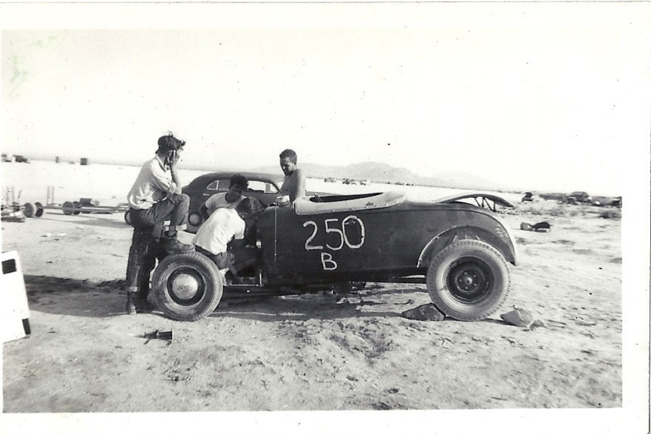 View attachment 2722540 View attachment 2722540 Again...thank you to all that have sent feedback!! I am so glad to see that I am touching so many! As long as you are interested, than I will keep posting away. Thank you to loudbang for cluing me in on the "post all as full size". My Grand Daughter just mite think I'm worth saving after all!! HA! Who said you can't teach a old dog new tricks!! I need all the help I can get. One of the things I'll always remember my Dad telling me, was how they used to drive [yes drive] some of these cars to El Mirage to run them! Now this was a 2/3 hour drive one way! They would get there early, sleep on the ground, in cars, wherever they could. In the morning they would start stripping everything they could off the cars to get the weight off. Lights, seats, bumpers, etc. After the meet, they would put everything back on and drive 2/3 hours back to Pasadena! When men were men!! So here ya are, I'm sending more for your enjoyment. Check out #250 B. Are those "OSHA" approved rocks holding that car? Just wondering.... I really love to hear you comments! Keep em' comin". View attachment 2722540