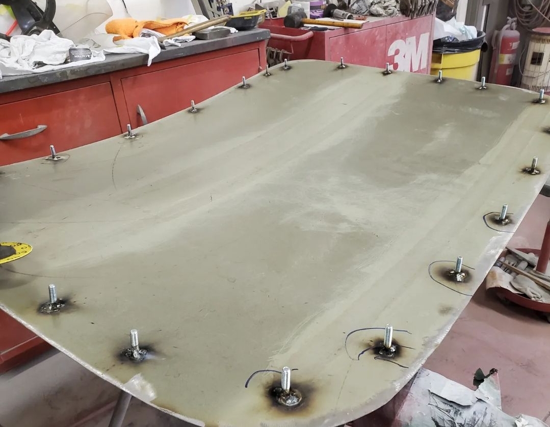 Roof overlay for my buddy Dave's 33 Ford. This is an old hot rod with a filled roof that had some bumps and bruises so I made this to clean the top up a bit. The metal panel is the middle of a roof skin from a modern car that had a nice crown in it that Dave had.