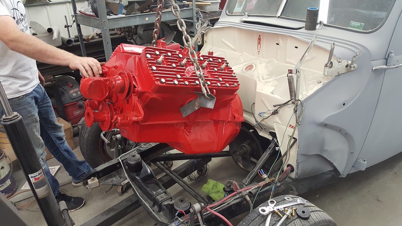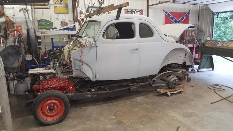 A update. The old coming out(sbc) and the new going in. Also separated the body from the frame. The body is going on a rotisserie for some sound deaden-er on the bottom and then black paint on the rest. sbc.jpg sbcgone.jpg 005.jpg 009.jpg