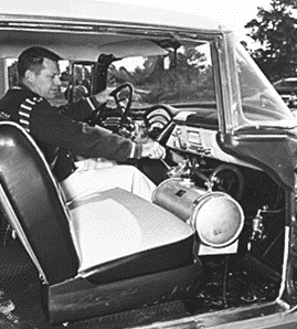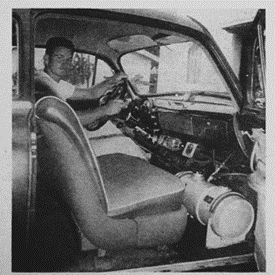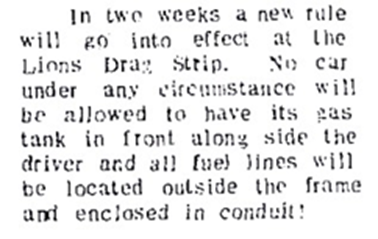 If any item was the start of the race car look, it was after August 1960, when the 1320 rules committee made the ruling that all aluminum Moon Gas tanks had to be removed from the cab and placed in the trunk or away from the motor. The options were trunk or behind the grille. Some went a little overboard and put it in front of the grille, sticking out like a prod. Obviously, it was no longer "street legal" to run around with a gas tank sticking out in front for any accident protection.