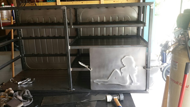 Here's one for critique. Not up to par with most of this work posted here, but a neat little trick I'm sure some can use. I have a little side work here and there building dog boxes, tool boxes, truck tool boxes, etc for guys that just want a little something different. Generally just simple bead rolled panels, etc, but I've fooled around with flames rolled in, etc, until this last request. Decided to play with the trucker girl logo and try to stamp panels if I could, so sketched up a silhouette, cut it out of plate, then a little heat, little hammering, etc and success. Just a pic of the first test panel, but I'm fairly stoked with the result, so thought I would share.