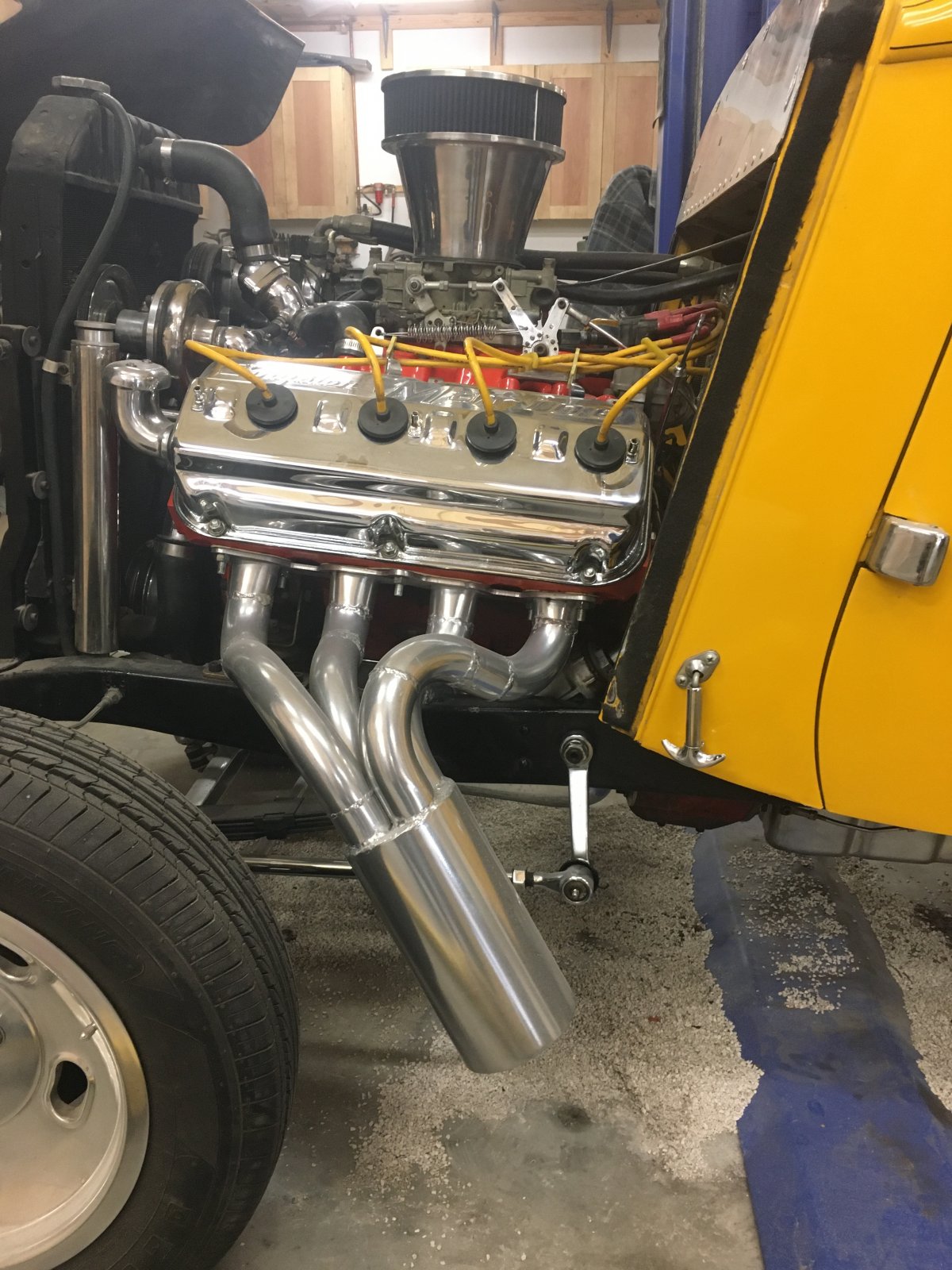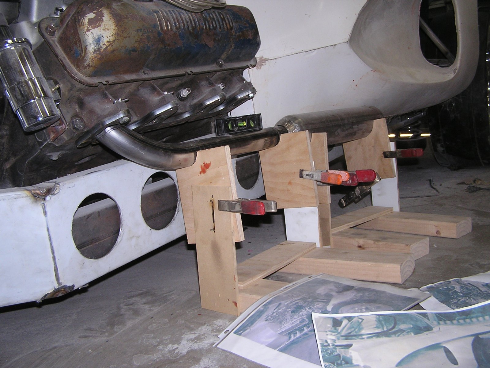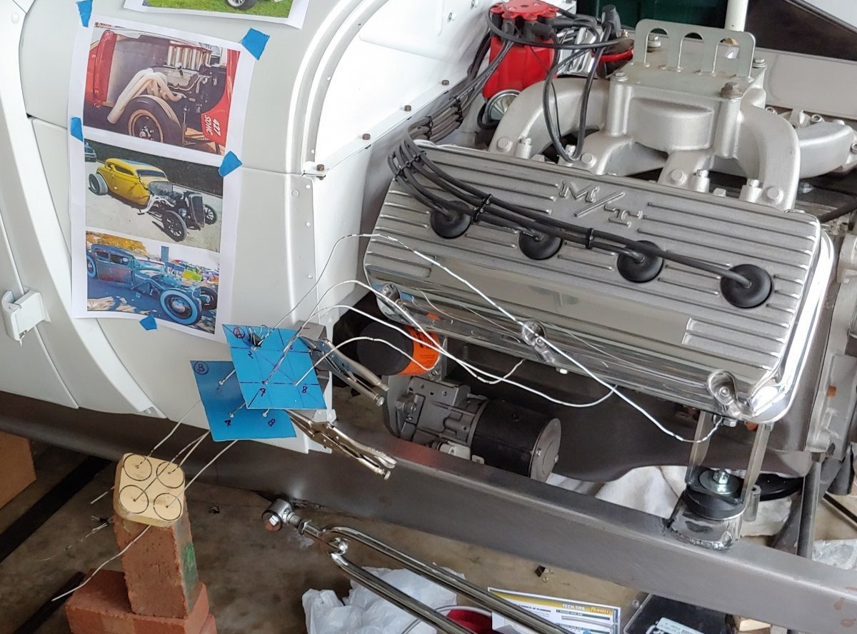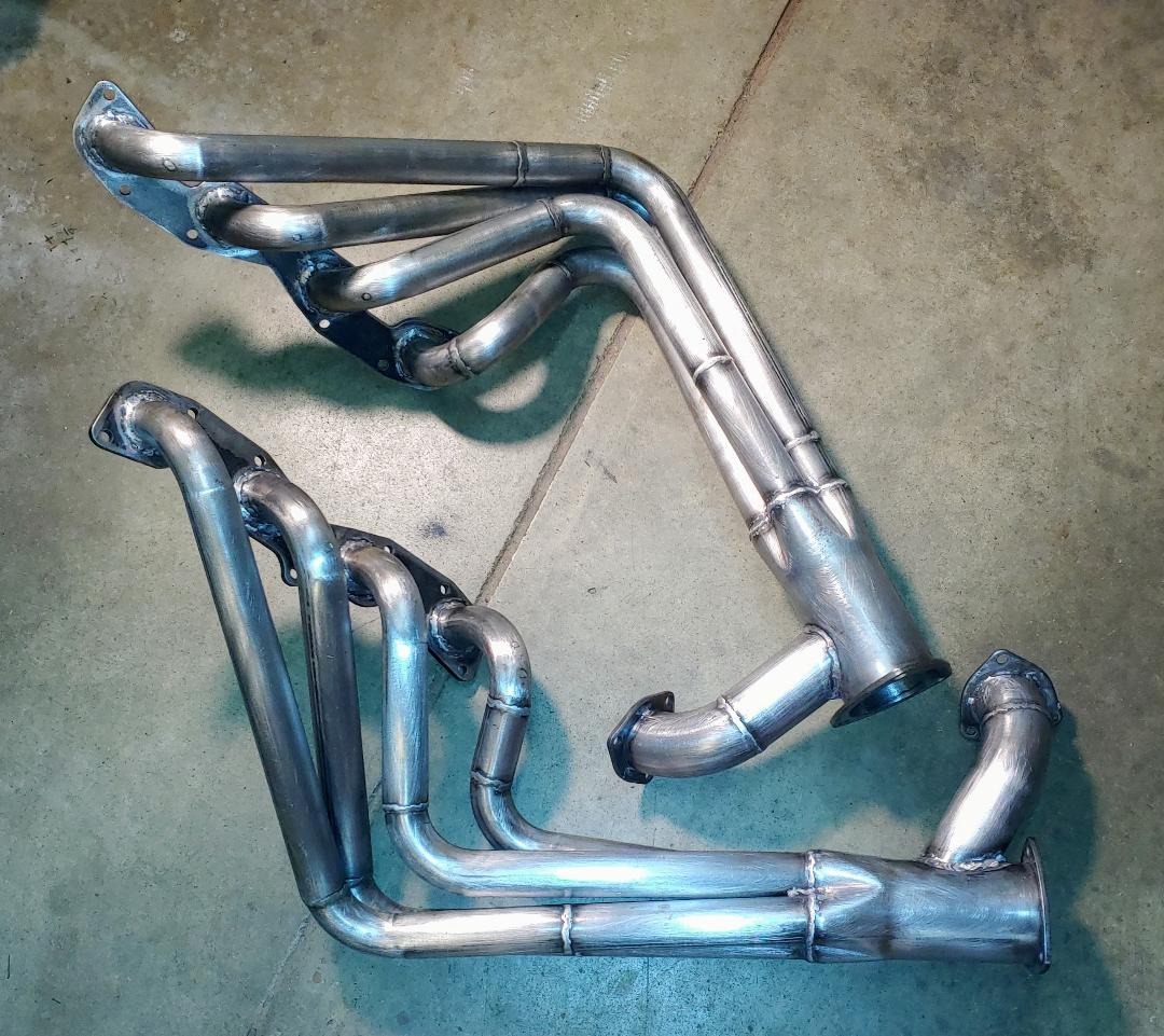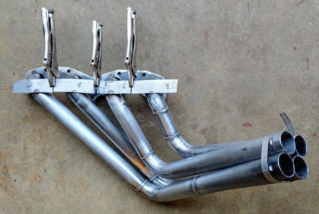 Get some 3' pieces of 1/8" steel welding rod. Get the proper 3/8" flanges (not 5/16"), get about 10 180 degree mandrel bends. I like mostly 3" radius bends but might get an assortment of 2" & 3". Might need a straight stick too. as I recall 331 flanges use 1.5" tubing. Finally you need a collector tube. On my 331 I used a 3-bolt muffler flange. I make a wood cradle to hold the collector in position, bolt the flanges in position then bend the wire in the shape for a tube. Go to my Harbor Freight band saw and cut the shapes I need to tack it all together. I am sure there must be a bunch of how-to videos on YouTube leading you thru the process. And it is fun. Finally get them Jet Hot coated. Don't fool with trying to paint them or building stainless steel ones. Jet Hot is bullet proof, needs zero maintenance and last forever. Or at least 'til they haul you off to Trembling Hills and who cares after that!! Don't have how-to pictures but here are a few in progress shots.