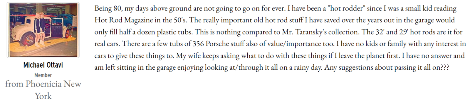 I've got a pretty major hoard of cars and parts including 10 finished Ford rods from the early-mid 30's and a few newer plus 6 project model A's already on 32 frames and enough parts to put together another half dozen model A bodies and a stack of already boxed 32 frames to put them on. I've got a good friend who is 42 that I work with every weeknight who is as ate up with hot rods as I am and a 3 year old grandson who's first word literally was "coupe". I'm just 63 so hopefully I have several years to turn more of my projects into drivable cars. After I'm gone I hope my friend can continue in my place of mentoring my grandson. I've got a few other younger friends that I can influence to enjoy the hobby too.