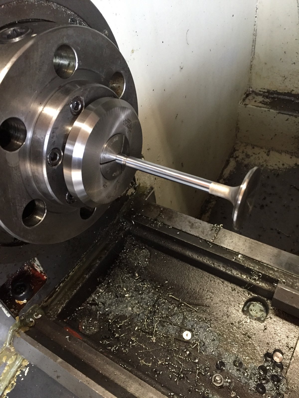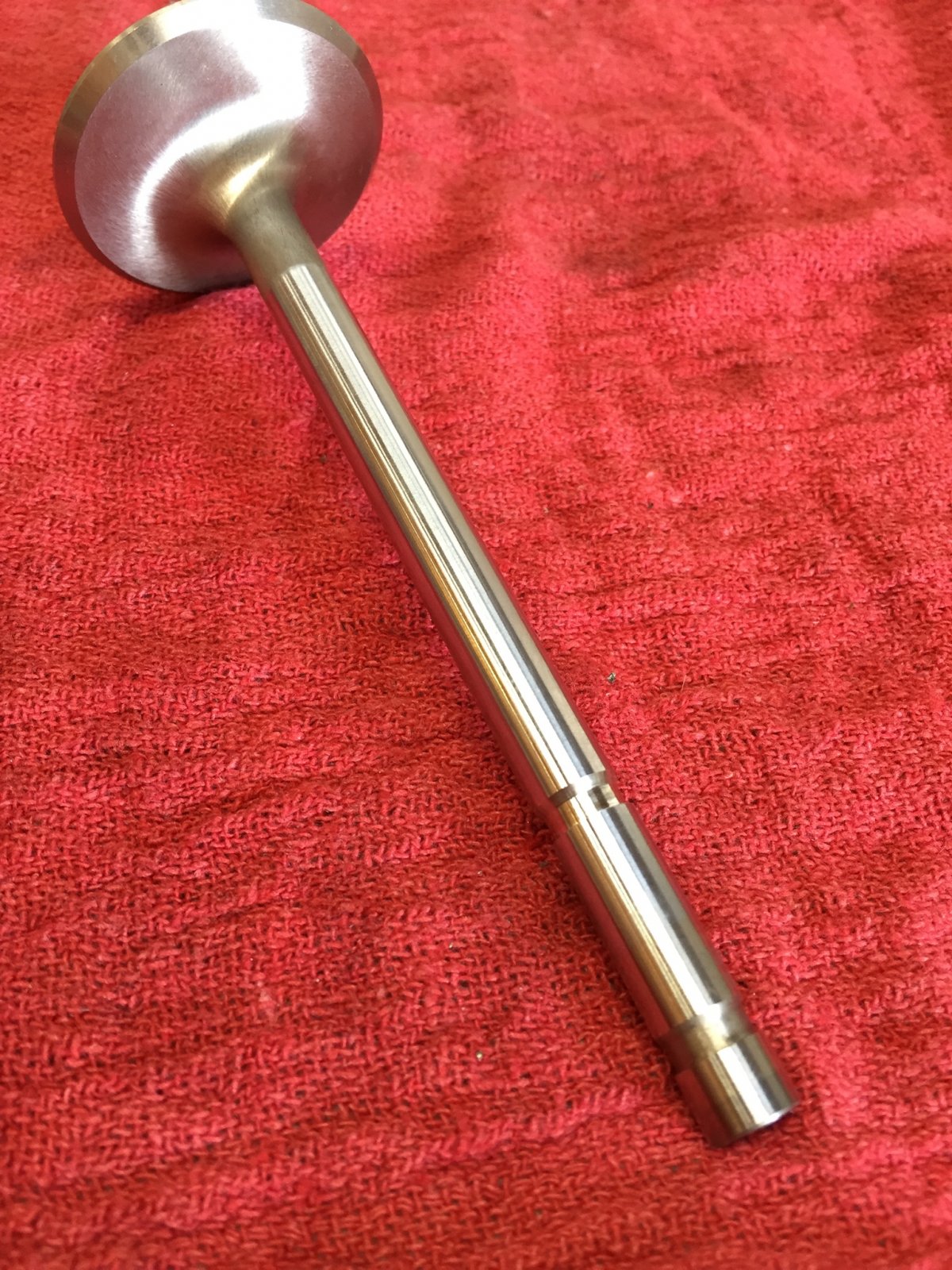 Looks a bit Gemsa inspired... With the exhaust pushrods passing thru the exhaust ports and all... Finding valves can be a pain... I always go straight for the Manley book to find something close. Avoid cheap valves as the chrome stems and stellite tips are important for longevity. Materials are important too, unless you like doing valve jobs. Springs seats can be spaced up, and keeper grooves can be recut further down. Manley has custom order options as well... get almost anything you want for $25 bucks a piece. May not have stellite tips or be titanium... but not too bad for special order! Here is the extra keeper grove I had to cut for my banger O/H. No sweat for a carbide grooving tool!