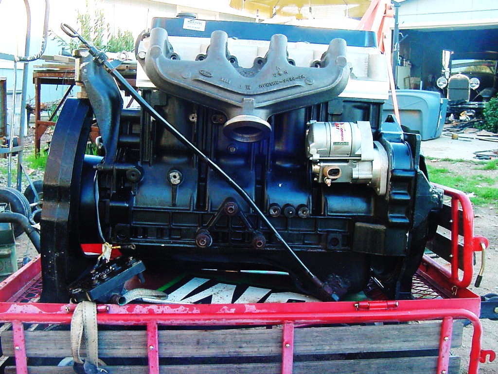 This is a Mocked Up engine. The block is a 4 cylinder 224 ci/in Mercruiser boat engine. I have just set a 460 Ford aluminum head on it with the Mercruiser QuadraJet 4 barrel carb and manifold. The exhaust manifold is a Ford side dump from a bus engine. The heavy Delco starter has been replaced with a light weight HiTorque IMI starter. The engine still has the front Mercruiser motor mount and the rear Mercruiser bellhousing/Motor mount. They will be replaced with side motor mounts and the T5 transmission mount. This engine should produce 200+ hp and will be installed in my 1600/1700 lb Model A Ford based Dawford Special. Similar engines will be installed in other Model A projects in the works. Ignore the 6 cylinder distributor cap it is only on there to protect the innards. Dick .