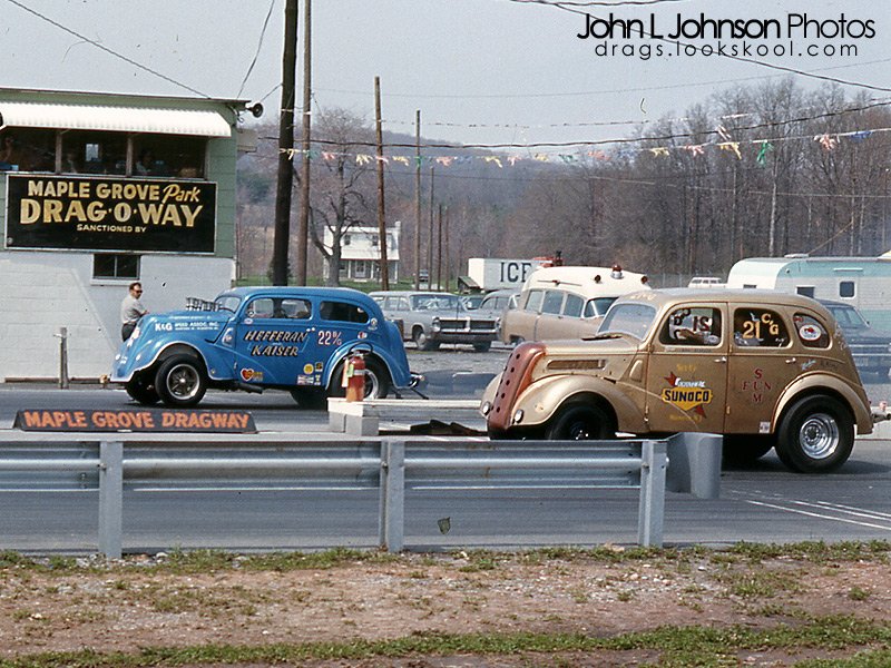 well, lets see..... small cubic motors, 60 pound flywheels, 2;64 first gear transmissions, 6;14 olds rear ends,12,000 rpm side step clutch leaves, shift at 8,800, go thru the lites at 9,200!!!!! the sound of 2 of these cars coming thru the traps at full song had to be heard to be believed. with our car we ran either f/mp or f/gas depending on which natl. record got hit that week by someone usually in the east somewhere. sure was fun to drive. we ran a carroll caudle motor back then, he was thee man! as an aside, the pics posted up there with stewart hairstylists in the background is in marion, sd. we raced there with guys like a young warren johnson out of fridley, minn. jerry hemmingson(jerrico trans), tom hoover all out of minn. stewarts also sponsored 2 really nice hemi super stockers both called 'hairbender' one of which is being restored in the chicago area.