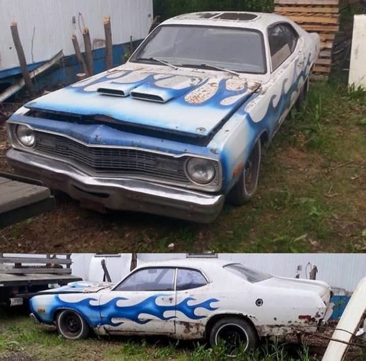 We bought this 71 Duster with a 400 auto in it hanging on elephant ears. Supposed to be a hot car. Yeah OK pull the other one. It had been around though, with a set of manual pedals in it and had been painted 3-4 times, a different color every time. That's me looking at the ground through the hole in the bottom of the trunk pan wondering why I let my wife talk me into looking at junk. Luckily the supply chain was still OK then and I was able to buy the metal I needed from AMD (trunk, fender, bumpers). Put carpet in it, rebuilt the suspension front to back, and stuck a 69 valiant grille in it because it just looks better. After about a year of messing around trying to get that 400 to even spin the tires, the starter gave up the ghost, I ended up cutting the headers off, then several exhaust studs stripped, so I called it quits on that and I built a stout 360 and put a 4-speed behind it with an 8-3/4 with 3.91 gears. Spinning the tires is no longer a problem. The big zip tie corrects the over-expensive fan shroud that warped while laying on a shelf. They put the K in kwality. I spray bombed the engine bay with B5 blue because someone had goobered it up with flat black and B5 is the original color. When I was mostly finished with it, I got a cancer diagnosis and so far I might have driven it 20-30 miles. Hopefully come spring things will be better. No, I am not going to paint it. I might touch up the spray bomb primer, but that's it. Maybe I'm weird but I like it that way.