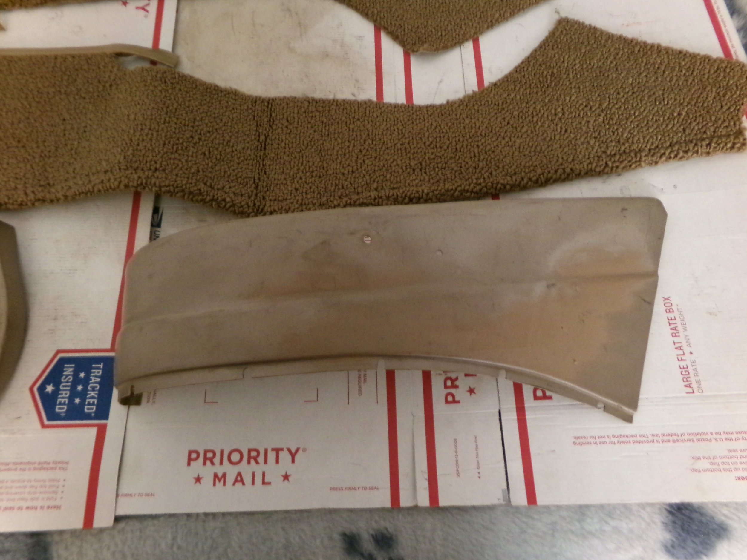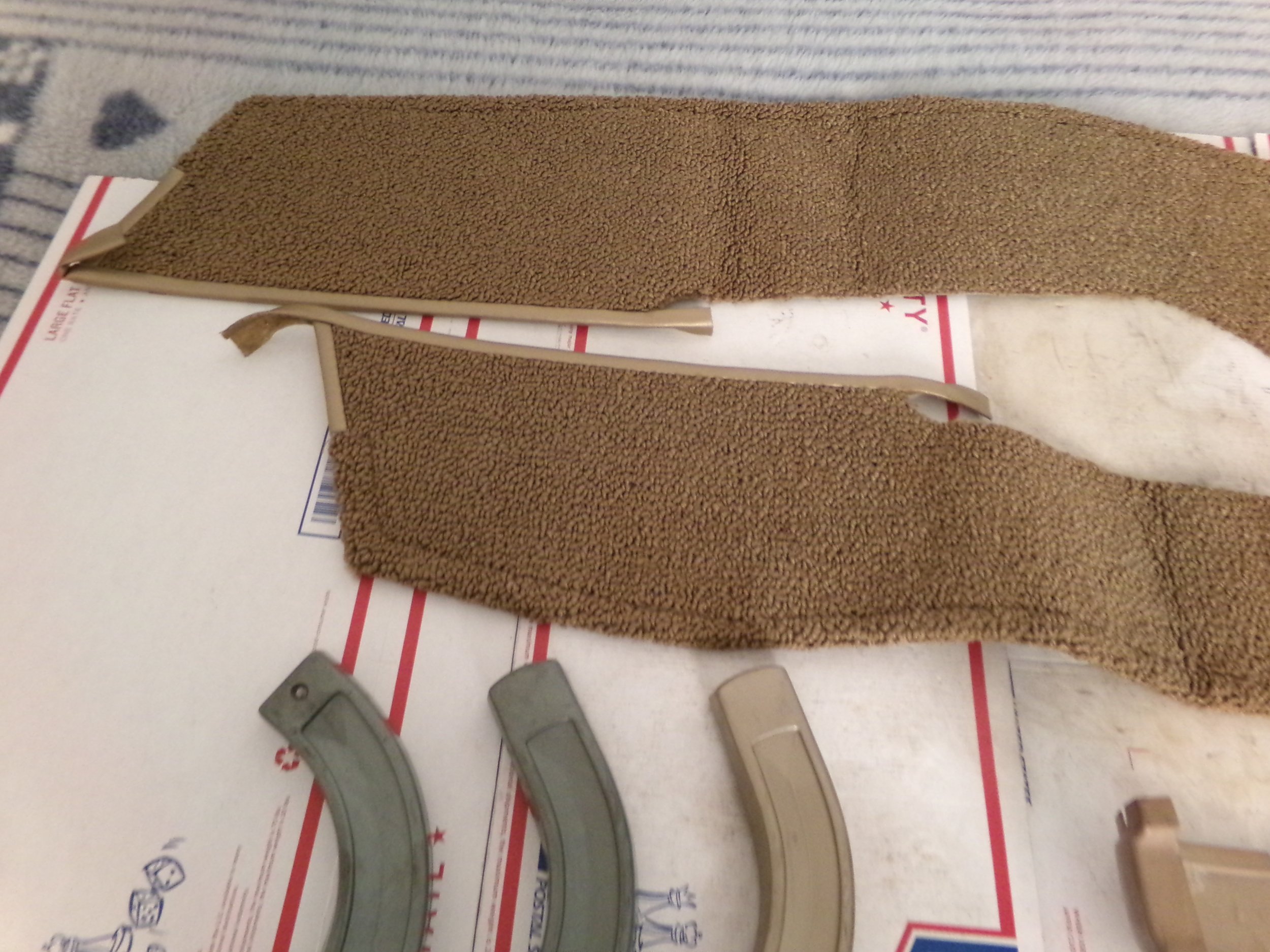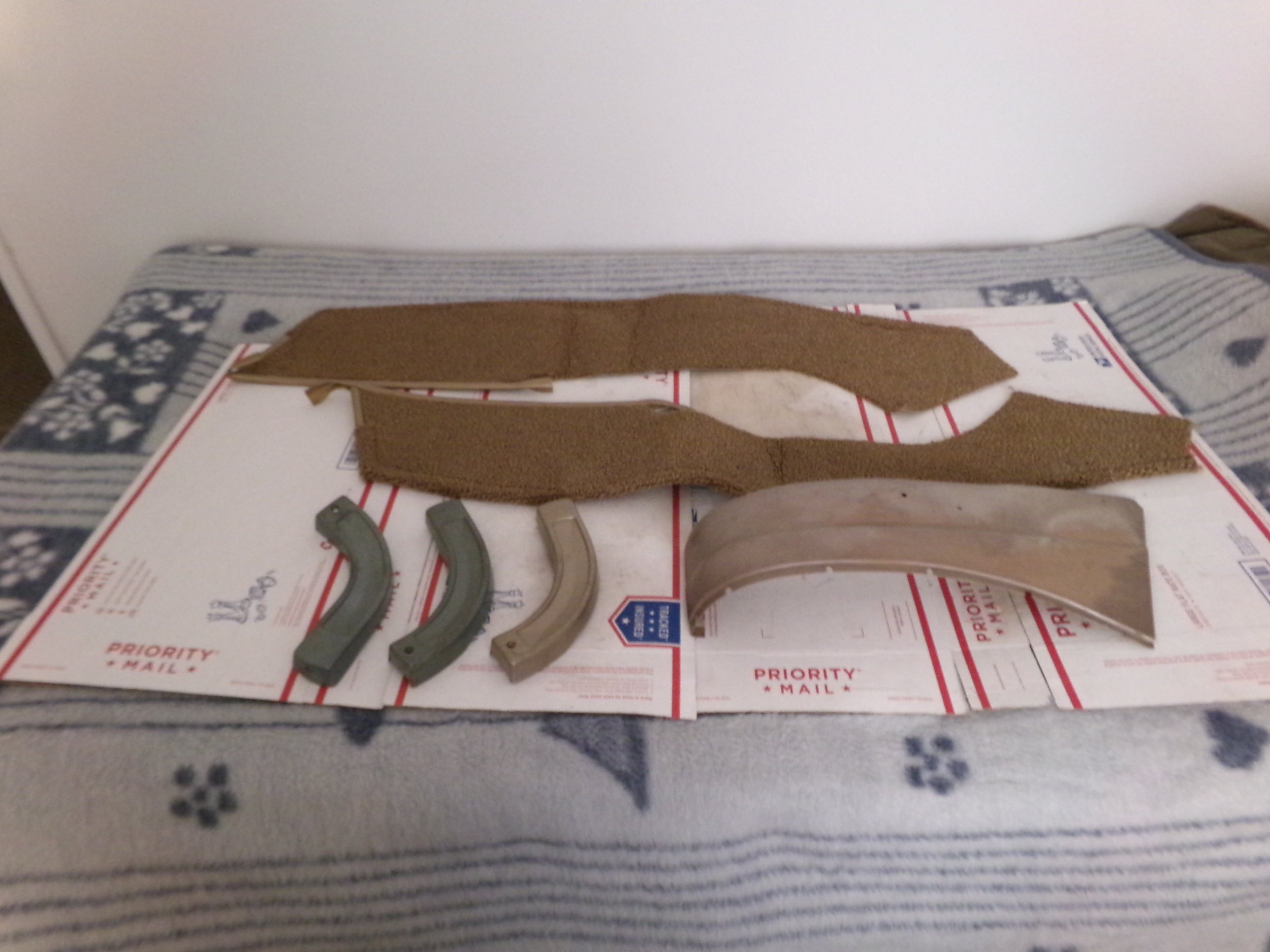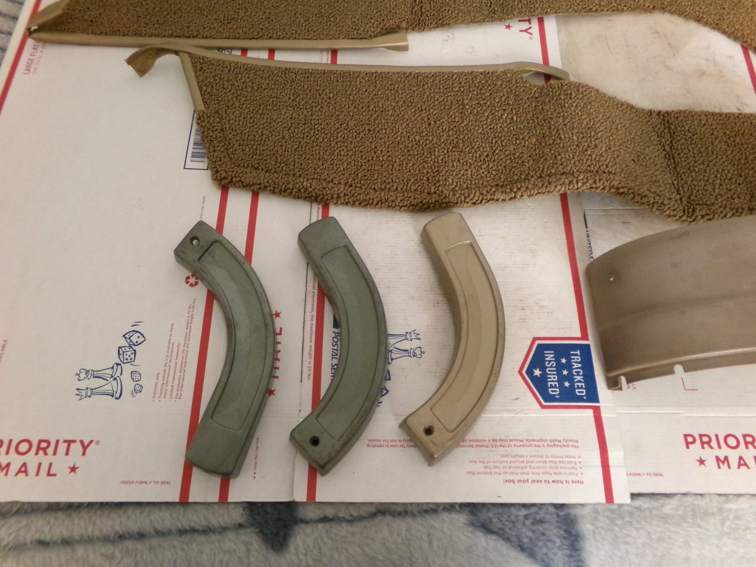 new LEGENDARY carpet for console. 3 hinge covers for a bench seat. 1 plastic cover for seat bottom. (paint to suit) no damage. I think all this stuff goes to 1960's cars. $30.00+shipping.
