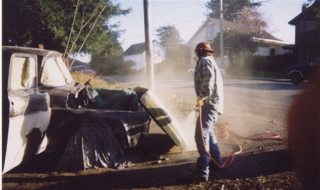 Been an interesting 4 weeks, and now that I'm working with pic scanners, thought I'd start with a pic of my truck from when I bought it in 'O1... my friends begged me to at least get the hood 'n front fenders to a solid color. Which we later Krylon'ed grey. Didn't stand up much to the Humboldt Bay air.