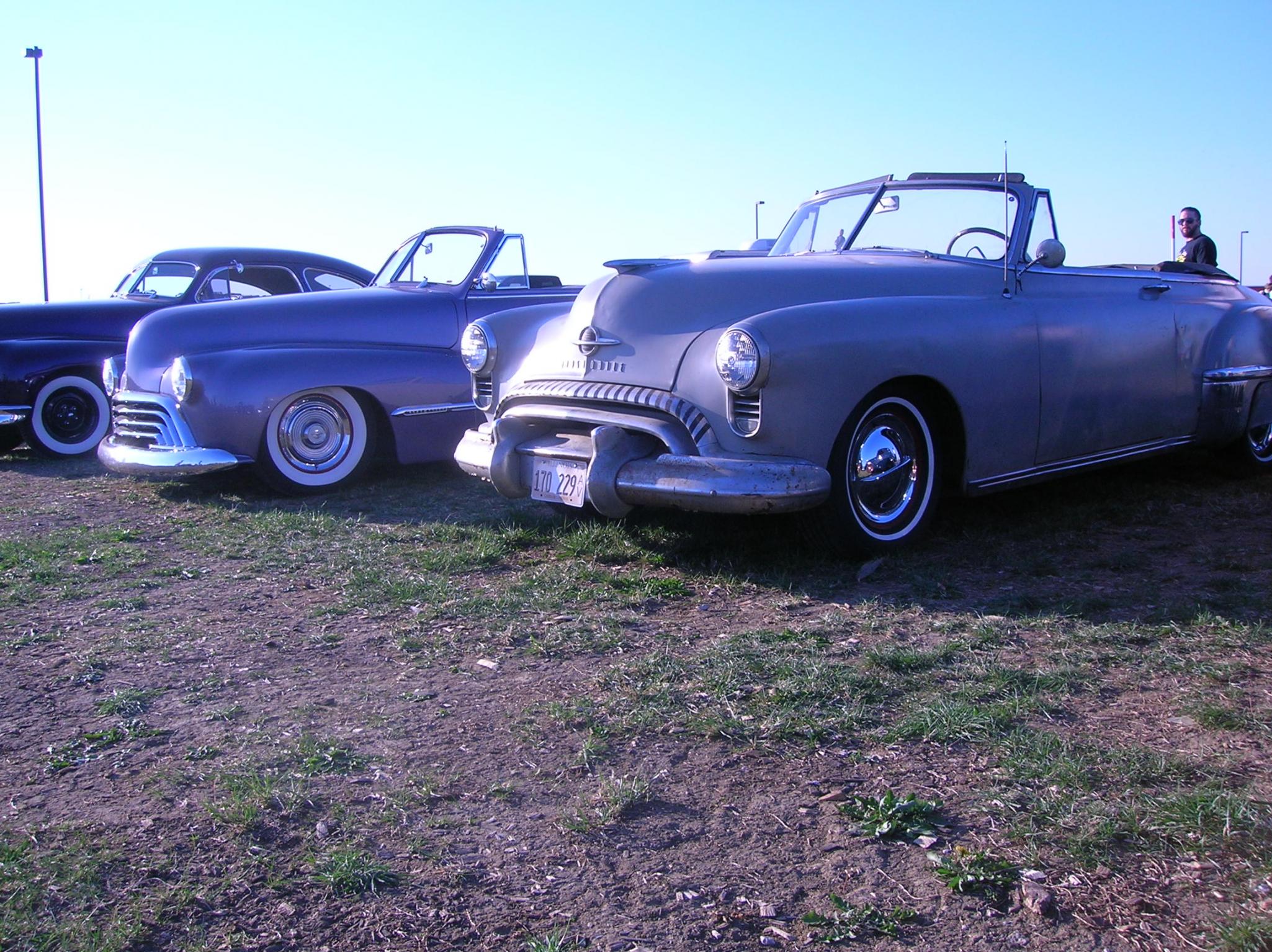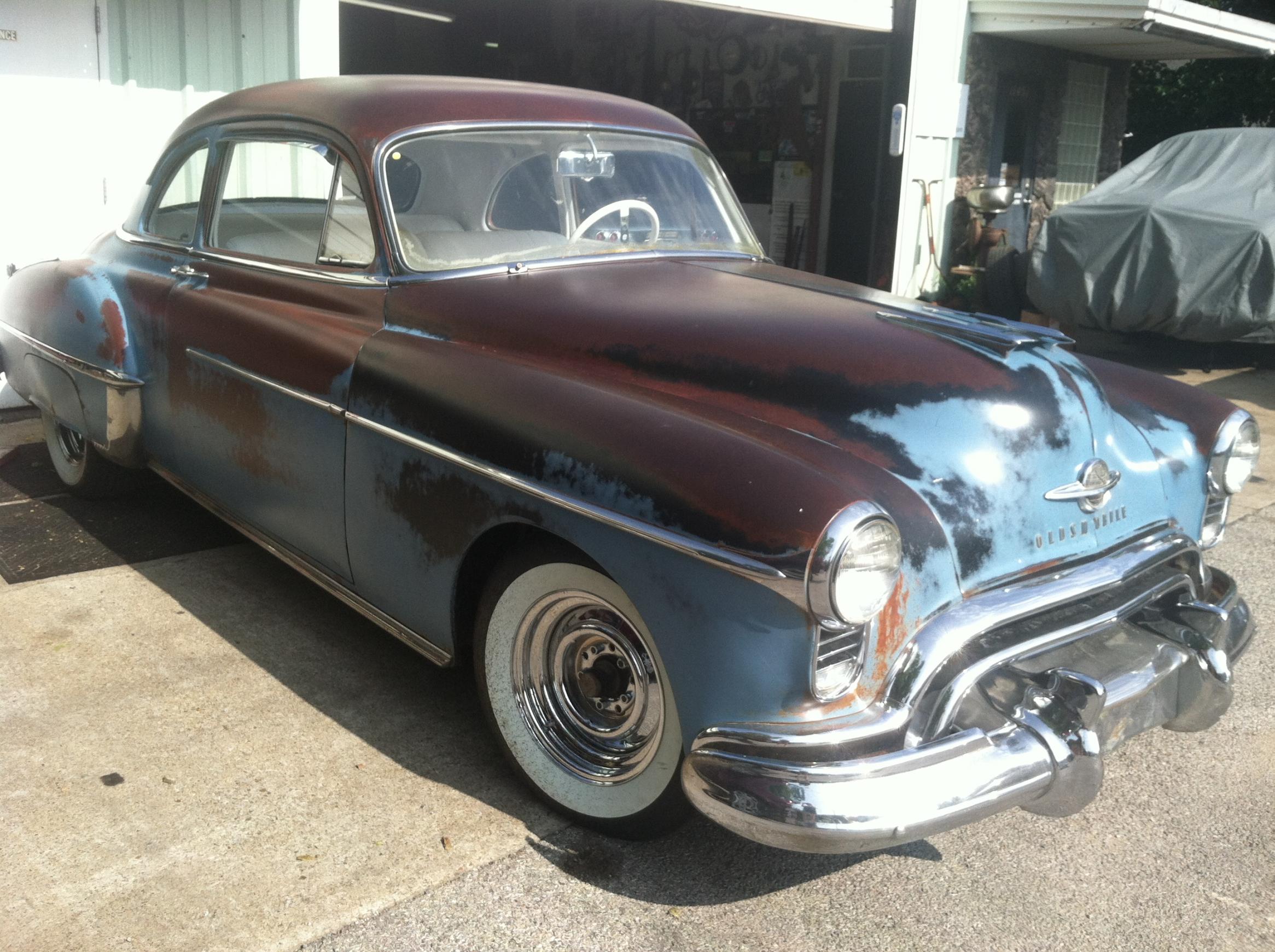 there was a 49-50 Olds in my neighborhood in the mid 70's. just sitting in the driveway. very faded candy red paint, louvered hood, shaved trunk, rusty chrome wheels and a nice "California rake" just like yours.... the best part was the old red and white tuck-n-roll interior. I never saw it move from the spot where it was parked. I'd ride my bike past that house a couple times a week going to my buddies house around the corner. it was advertised in the paper when I was 15. then it was gone. if he had waited a year to sell it I would have probably bought it. bought a 1949 Chevrolet instead.