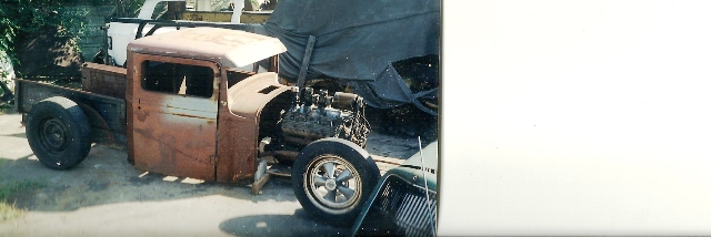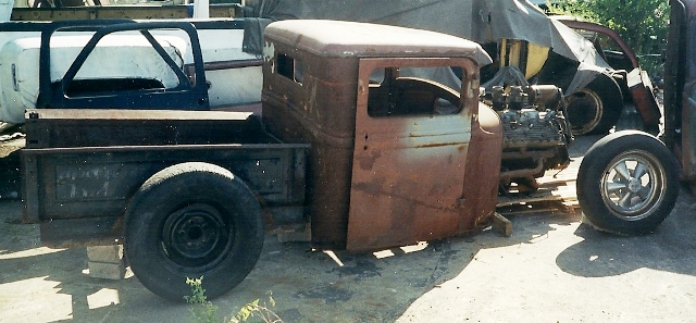 I bought this YEARS ago, (when '32-'34 trucks were still reasonable!), when I went to look at some Model A parts, it was hanging in the rafters of the old guy's pole barn! His story was, he was in Idaho on business, and the morning he was leaving to come back to Michigan, while having breakfast, he noticed a flier for a local estate sale on the board in the resturant...he found several Model A's, and this '33... ...apparently, the old guy he bought it from, started on it in 1950, when he was 15 years old, and never finished it! Five inch chop, and channeled the height of a '32 frame...I bought the cab & doors, along with a Model A bed, and an A frame... Being 6'5" tall, at 250lbs, I can't even get in the thing, but, it's looks bad ass! It went into my storage building, along with all my other "projects", and sat...several years ago, my buddy Rob wanted to get rid of his '59 Ranchero, and offered to trade me for the '33 cab, box, and a '32 grille shell...I agreed, on the condition that, if he ever wanted to get rid of it, I would have first shot... He started collecting parts for it : a '32 frame, '32 front axle and 'bones, complete '48 rear with brakes & 'bones, set of four 16x4 '40 wheels, '58 Vette 283, firewall, etc., but, that was as far as he got, no assembly at all... About two years ago, he decided to down size, and offered me the truck back, (at a SUPER price!), with all the parts he scored, but, it was tucked away in his garage behind his nailhead-powered shoebox, his T-bucket, and several motorcycle projects...this last Saturday, we were finally able to extract it!