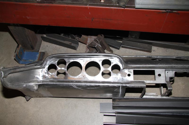 Here you can see a plate mounted where normally the dash panel would be. Its going to be a backer plate for a custom dash so it will be removable. The idea is to graph in a completely customized dash from a 58 impala. The 58 dash in these photos show the original dash with the instrument cluster backer welded in. Also, the area where the steering column was has been patched.