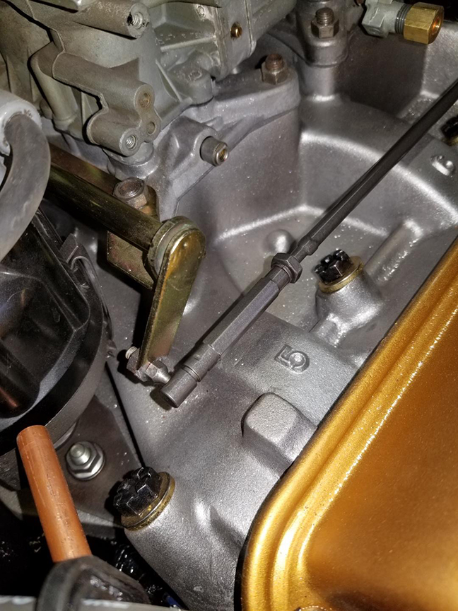 When we first placed the engine in..... It sat very far forward.The engine mounts I have.... are for a 58 332(I think)But they may be a stock 292/312 Y Block V/8 mount... I ordered them a very long time ago.Anyhow... we turned them around(motor mounts) and the engine sat back (1-1/4)---(1-1/2) which was perfect.We jacked around with lifting the driver side mount about a 1/4 inch and just offsetting the trans towards the pass. side... not a lot.....very little. Worked out very well. A very dear friend and Genuine Old Ford man told me to do this... because he did it in his 58 Ranchero in the sixties with a 406. Anyhow.... the Z-Bar is square to the engine and frame.... but needs to be shortened quite a bit(not there yet.) I am venting the engine at the rear of the intake with a standard PVC into the rear base of the last carb.Oil will also go in the PVC vent hole when I need a Oil Change.The block oil filler tube is just me cleaning up the engine.....EDIT* I will be using a short modified Oil tube in the front... have not installed as of yet. This whole build is basically a throw back to.... what would a Junior Ford Engineer do given an Old Mule car and free reign.I want to try and stay with ALL Ford Parts.......Speaking of which..... EVERYONE tells me to use a Hurst comp plus shifter and ditch the factory unit..... I'm pretty stubborn..... The Hurst is a better unit..... but..... it's not what I am looking at....... but..I may cave. My pal Rob is the Brains and thinker here... he used some stock Ford linkage and got it all together.Rob is responsible for the metal work.....well.. so is Tom the painter. Cool simple linkage.