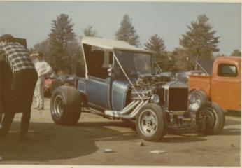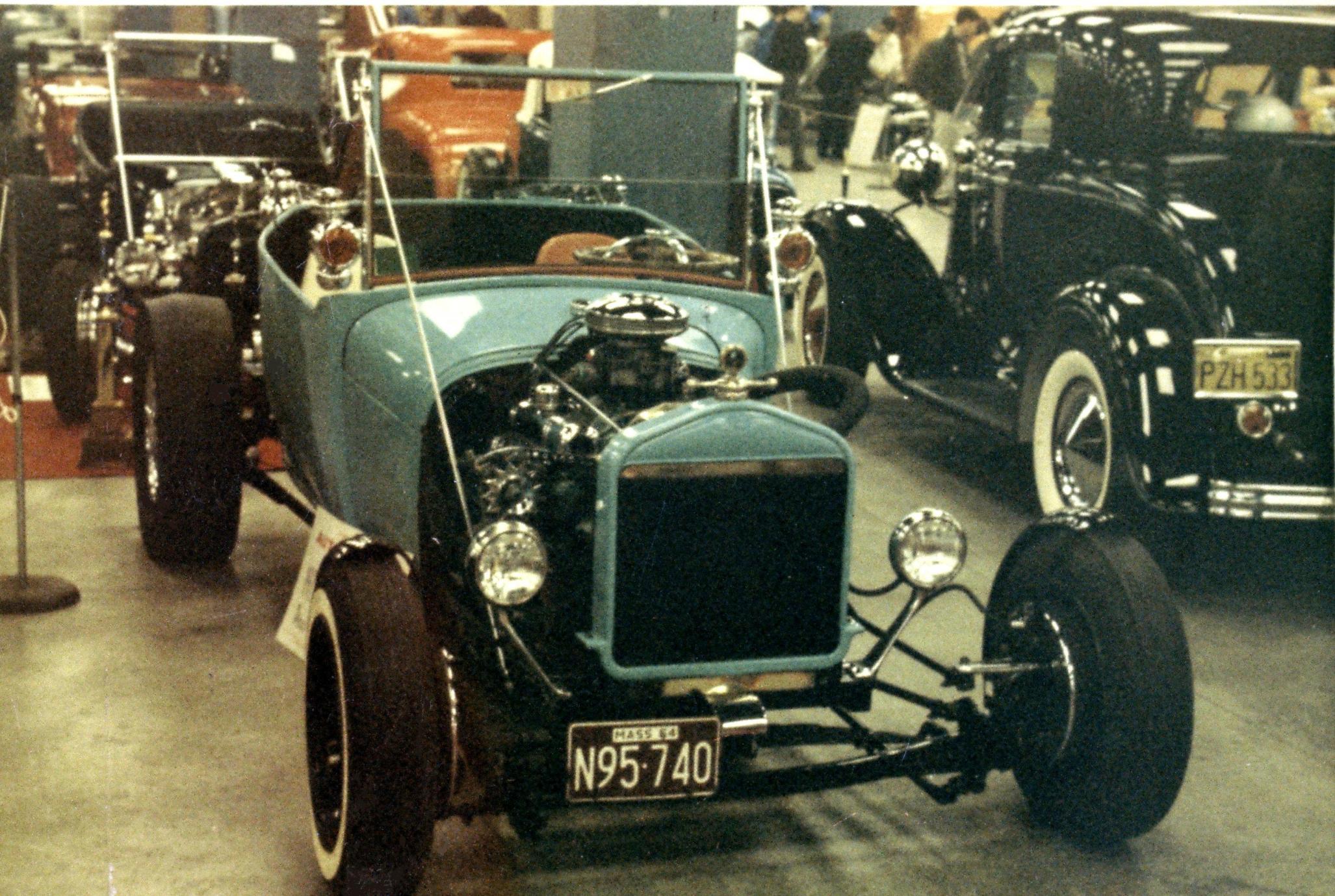 The blue A bucket actually started as a sedan! George Ryan of Auburndale, Mass. built it. He took 18 inches out of the rear quarters and adapted the back to the front. The result was an 80 lb. bucket. It originally mint green and was at the Autorama on the Hynes Autotorium in Boston in the 60's.Photo and story was featured in the "Letters to the Editor" section of the Nov. 1964 issue of Hot Rod magazine which had Don Prudhomme's silver dragster on the cover.