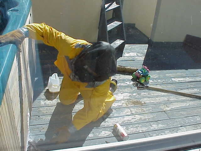 7. Better than a bite. Here's me getting rid of a huge honkin' wasp nest that had been built inside the foam of our hot tub.... was fun getting in before we (I) got rid of it. My wife and kids provided great moral support from inside the house. Was 90+ degrees outside. I used a rain suit, rubber boots, thick leather welding gloves, sand blasting hood and all cuffs duct taped.