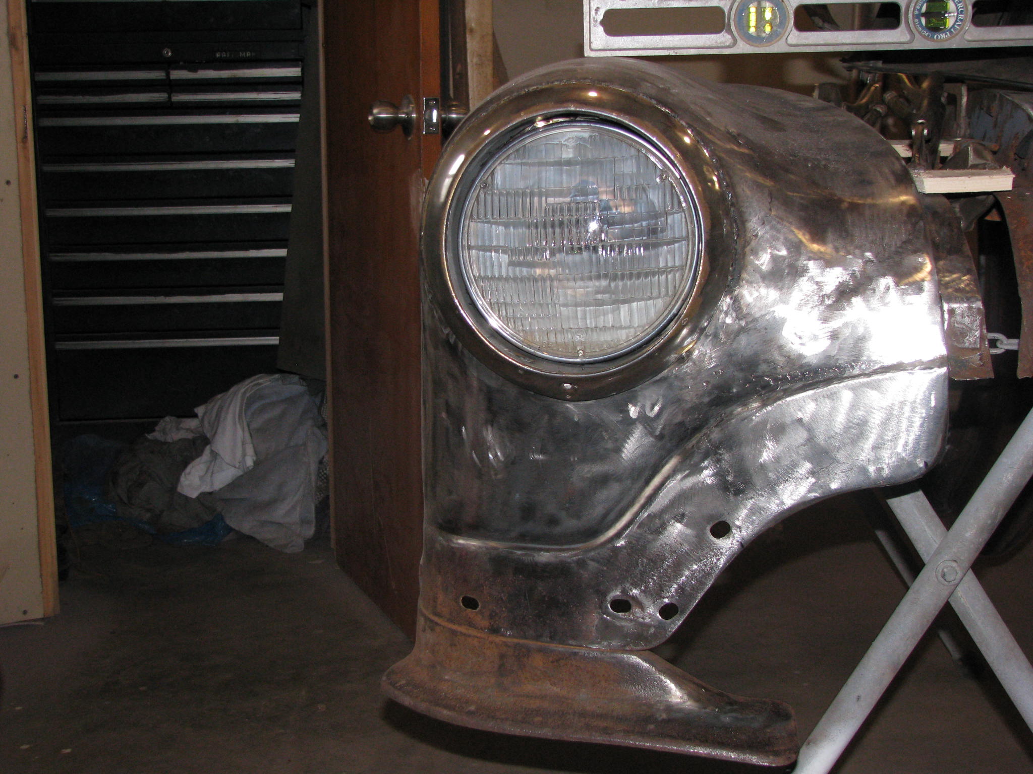 Hello Hambers Slow but sure progress. The fender is coming along . I scored some very nice headlight buckets from Ohio should be in soon . I will be able to finish this fender french job . Turning out good . The headlights are frenched a tasteful 1 1/2 inches. Just enough. On another note I found some bottom door hinges for the Buick . If you recall the previous owner or maybe the owner before him lost the hinges . There is an old guy just 20 mins from me that has 2 Buick parts cars and they are full of good stuff . aw1950