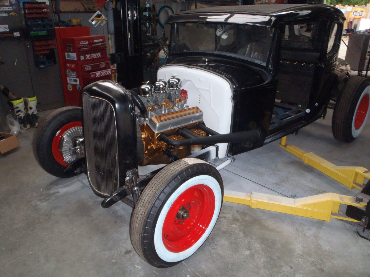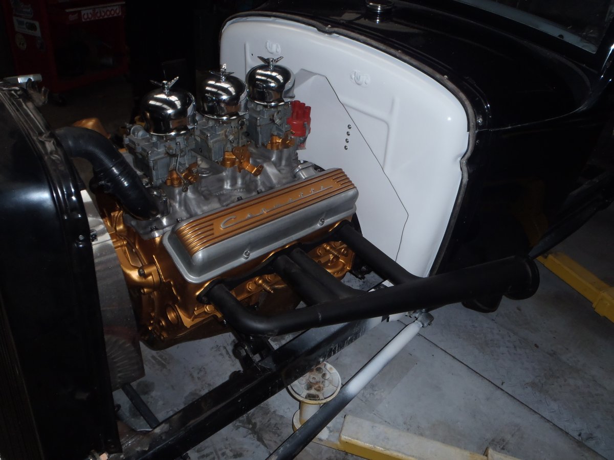 Thank you Whitewallwilly for the kind comments, seeing the quality of your build makes the comments even more special to me. A few pics of recent progress ( not really progress but future plans ). I pushed car outside to look at it from a far to determine if I have done the right thing - painting engine gold, I feel it looks good up against the white firewall. I also plan to make spacers ( approx 5/8 inch thick - may even drill spacers for nitrous ) for the carbs using of cuts from the alloy plate used for the 409 rocker cover adapters. Glen