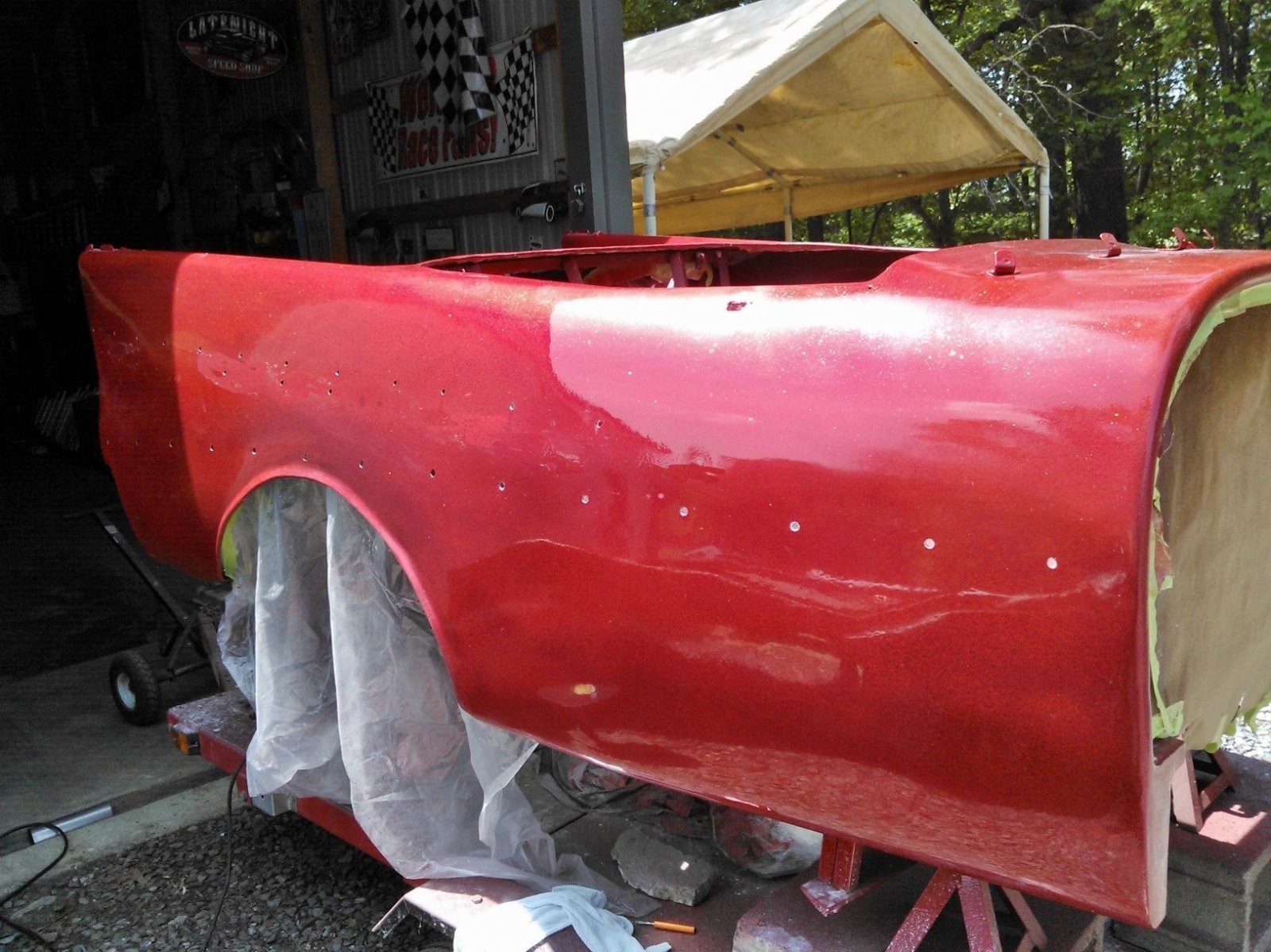HaHa!! I knew someone would ask soon,I have been working on the wet sanding a little here and there,I should have a lot of me time this weekend to get a lot done,pics will be coming!!!Also I have talked to the chromer he said maybe this week the chrome should be done I will try to pick the stuff up next week,pics of that will come also,After all that the project should go a little quicker!!