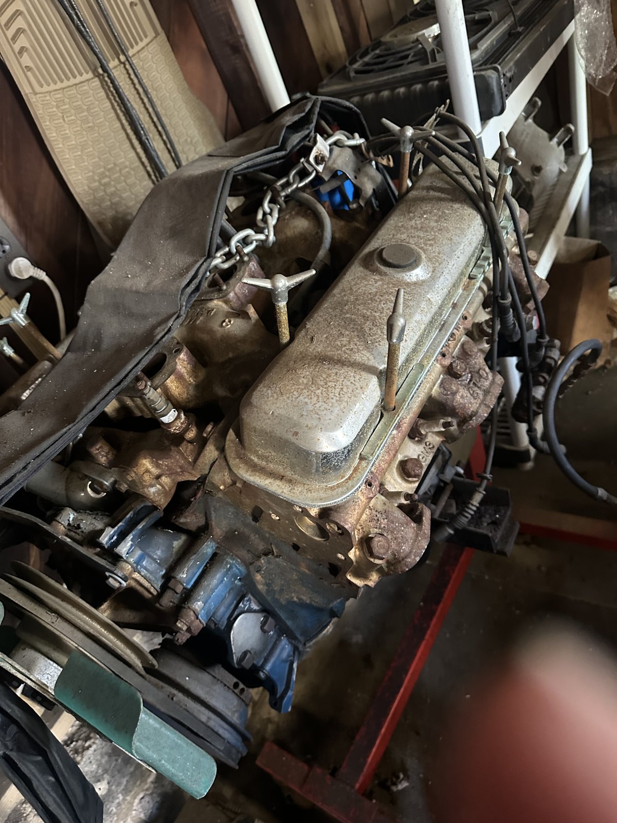 Those are good cylinder heads, one of the better casting numbers. They might need slightly dished pistons to run on todays gas though. l If it came out of a GTO it’s likely a 400, but it could be a transplanted 428 too. With the timing cover having been painted a non-Pontiac dark blue it makes me wonder if the engine hasn’t already been rebuilt at some point in it’s life. Hope it turns out well, Pontiac’s make great torque and are wonderful street engines.