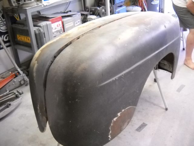 4.5" electric angle grinder. Very little pressure, let it glide on the work surface. The wheels aren't cheap, unless you get them on the intarwebs. About a half of one wheel did those rear fenders. The brown wheels are the best.