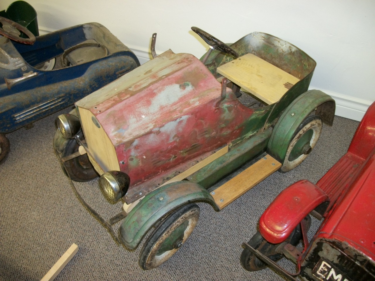 WOO HOO I finally found some time to work on the buick and got the drivers door operational. I ended up using the original hinges with a little modification for adjustment still needed, but at least now it opens and closes real square to the body. one more thing to check off my list. I also found but couldn't buy when I was in Atwood kansas a couple of week ago this nice little buick roadster peddle car. I believe it was between a 26 to 28 model year. He had just got it for his collection and it was out of my price range.