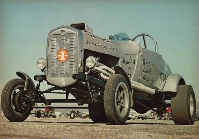 The lack of a license plate, and the race car in tow sticker on the bumper are clues this was a drag car. Maybe not a gasser, maybe it was? That picture doesn't look like the staging lanes to me, maybe the pit.