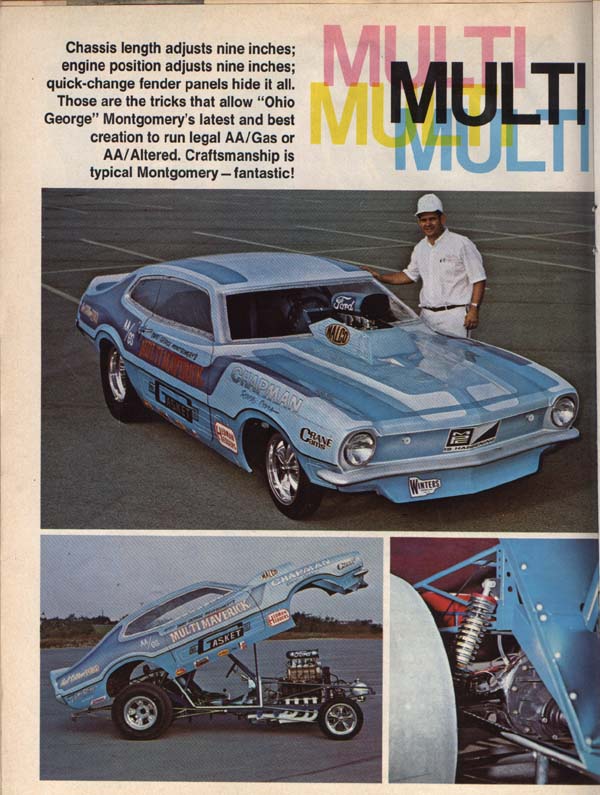 I'm working on the restoration of Ohio George Montgomery's Multi-Maverick. I haven't been able to find much information on it. I have the Hot Rod magazine article about the car and a few other photos, just not enough photos with close up details. It ran a blown Boss 429, but not sure what transmission it had. I've contacted Joe Aroso, who owned and raced it before the current owner purchased it. He was unsure of when some of the modifications were done to it, whether they were done by George or Joe and his brother. The car was originally built by Chapman Race Cars in Ohio. If anyone has any information, photos, or knows of someone who worked for Chapman Race Cars, please contact me. Trying to be as accurate as possible with the restoration.