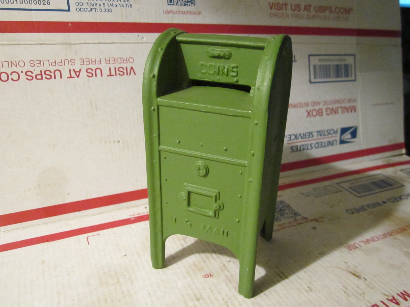 old cast iron bank. U.S. mail. repainted. 5-1/2" tall. trap door is missing. $35.00+$12.00 shipping.
