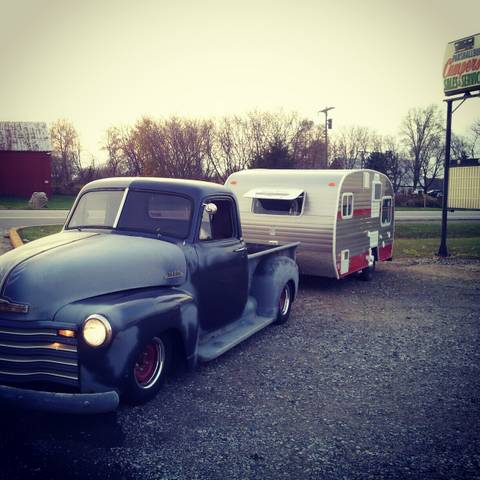 My '53 Chevy truck with a retro styled 2013 White Water travel trailer, my dad owns an RV dealership & they sell these retro look campers.. www.parshallburgcampers.com in Michigan .. thought I'd share if anyone hasn't seen these before