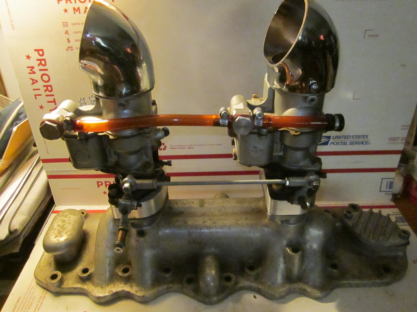 flathead ford V8. offy manifold with original breather. the early offy manifolds came with breathers. ports smoothed out nicely. modified ford EAB carbs. the builder put this note with the motor. " if you decide to run the autolite carbs in the future and want to sell the two 94's that are on the car presently, I have over $380.00 in the set up and that does not include the 2X4 intake. the holley 94 carbs are pro built, very nice units" (I know, but I copied the note word for word) it comes complete as shown in pictures. $800.00+shipping.