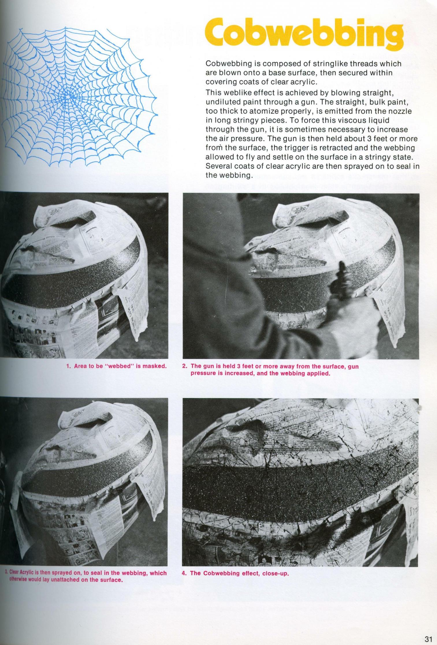 I used to spray webbing while building fiberglass boats,usually cockpits and interiors. For gelcoat we actually used to buy gallon cans marked as "webbing solution"to mix in the gelcoat.The farther away you shot from the larger the pattern(?) in the string would be. I wonder if the webbing solution is compatible with paints or for that matter if it is still made. It's been a good twenty years since I was doing that....