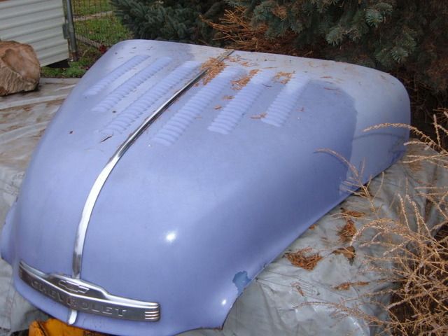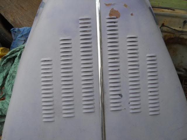 Spacing is going to be what the die allows. I have these photos of mine that were done in the 80's by a guy in Bremerton Wa with an old air opperated press. His die had a flaw in it that left it's mark on each louver that a few guys spotted and knew who had done the hood. I think it was done in 1980/81. as I drove it to Texas in 81 and the hood was louvered then.