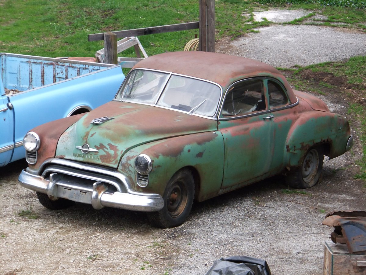 Here is my '51 88A that I picked up last September, it's pretty much stock right now. I don't know a lot of it's history other than it came from eastern Kentucky. The guy that I got it from had it about a year and in that time all he had done to it was cut 1-1/2 coils out of the front springs and he took care of some maintenance item's. I'm not sure if he added the '56 Olds wheel covers or if a previous owner did. Since I have owned it I have had the carb professionally reconditioned, dealt with a starting issue nightmare and rewired it! My plans are to get the ass end down, install a set of Jeffrey Allen headlight visors and clean it up. Got to get it ready to take to the Stray Kat 500 next weekend. Pictures were taken by the guy that I got it from...