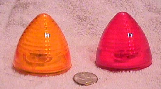 Thanks fellers for the compliments! rdstr31...thats a good idea! I gotta keep that one in mind, thanks! Rocky, yeah there are baskets of those things and no one has a problem with me taking a few here and there. They do melt them down and reuse them, but as long as I don't go overboard there hasnt been a problem. Its nice to have a piece of cast to work with and not feel guilty as if I was using billet Fraz...lemme get mine done and then I'll see what I can do, ok? Yorgie, I pitched the boxes, but I can get that number for you tomorrow. I gotta stop in there and I'll make a point to get it. 52chief, we have a Navistar dealership here that carries all sorts of neat pointy lights. Some look like the 59 Caddy lens, and in red or amber. As you stated, they are very low-priced. I think the ones I got from NAPA were about $3 each, and the ones I have gotten at the Navistar are cheaper than that. Here is another style that I use and I have been selling a few of them. The lenses are from Navistar and I think they were about $3 each. They were a complete light and I had to remove the lens with a Dremel, but then PVC cement will set them up tight to a piece of PVC. The housings are made from a PVC couple and a PVC cap. I turned the cap on the lathe to center the hole and cut the chamfer for the bulb holder, then turned the coupler to fit inside the piece of tubing. You weld in the tubing and then slip the light assembly in the tube and tighten up a setscrew. They use LED 1157 bulbs, but I can do them solid state with no bulb contacts to corrode.
